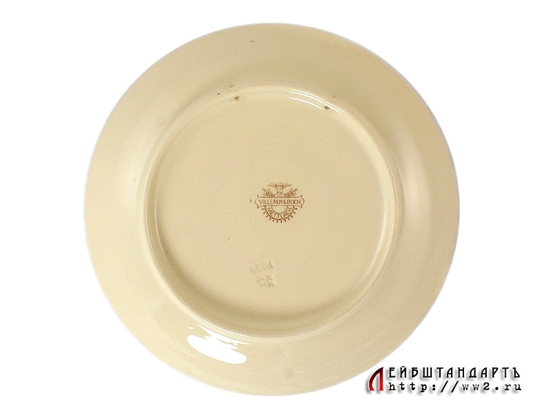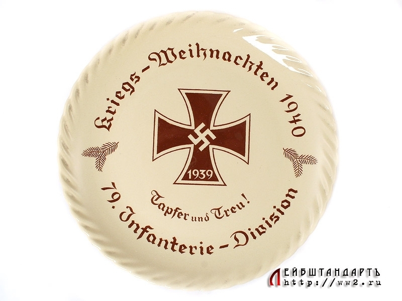 Декоративная настенная тарелка "Военное Рождество 1940 года" с изображением Железного креста, изготовленная как памятный полковой сувенир 79 пехотной дивизии. Тарелка изготовлена из тонкого фаянса, покрытого светло-кофейной глазурью (все надписи и изображения подглазурные), на бортике имеются отверстия для настенного крепежа. Изготовлена известной фирмой "Villeroy & Boch". Отличное коллекционное состояние.