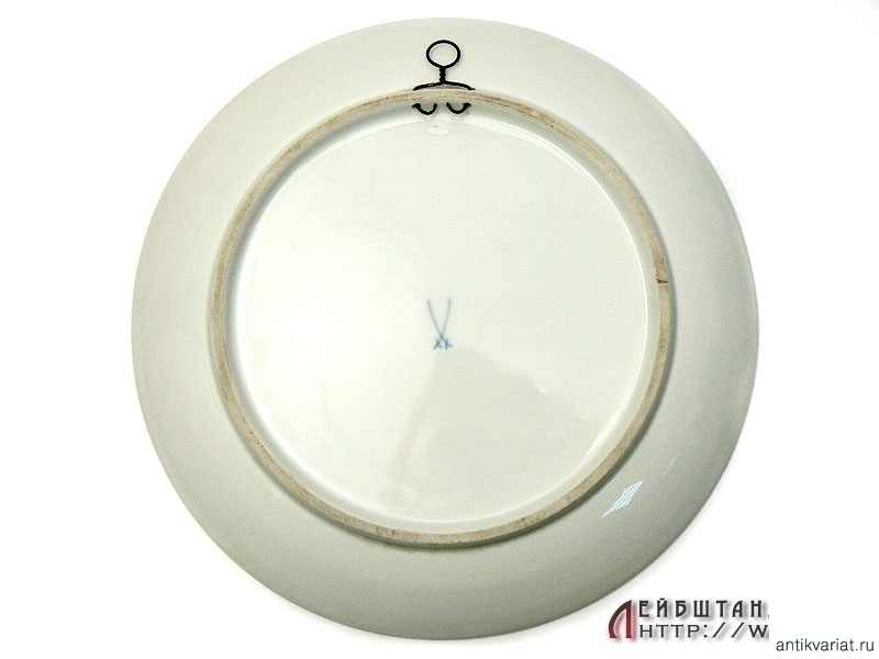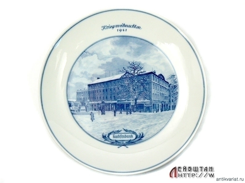 Декоративная настенная тарелка, изготовленная к Рождеству 1941 года, с видом Саксонского банка. Тарелка изготовлена из тонкого фарфора (все надписи и изображения подглазурные), на бортике имеются отверстия для настенного крепежа. Изготовлена известной саксонской мануфактурой в Мейсене. Отличное коллекционное состояние.