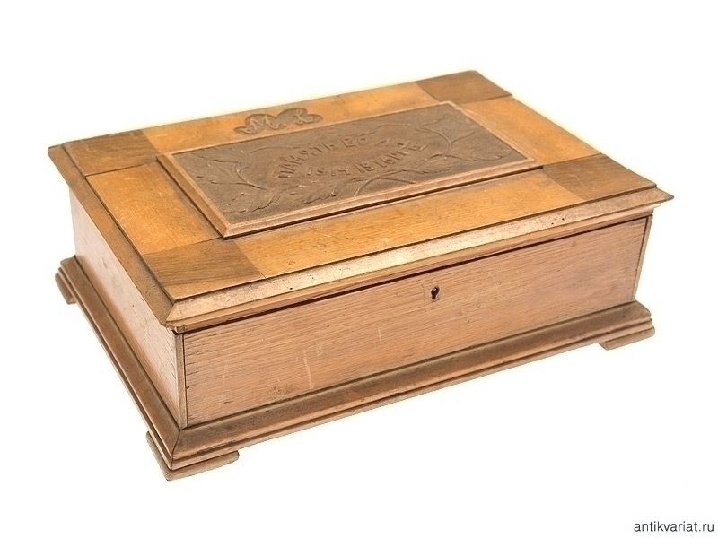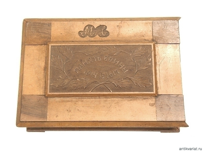 Сувенир времен Первой мировой войны - резная деревянная шкатулка с растительным орнаментом и надписью: "Память войны 1914 - 15 - 16 - 17". Подобные сувениры обычно изготавливались русскими военнопленными на продажу или для обмена на продукты. В любом случае, очень антуражный предмет и настоящий памятник эпохи. Отличное состояние, без реставрации.