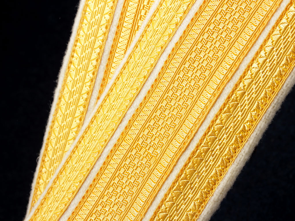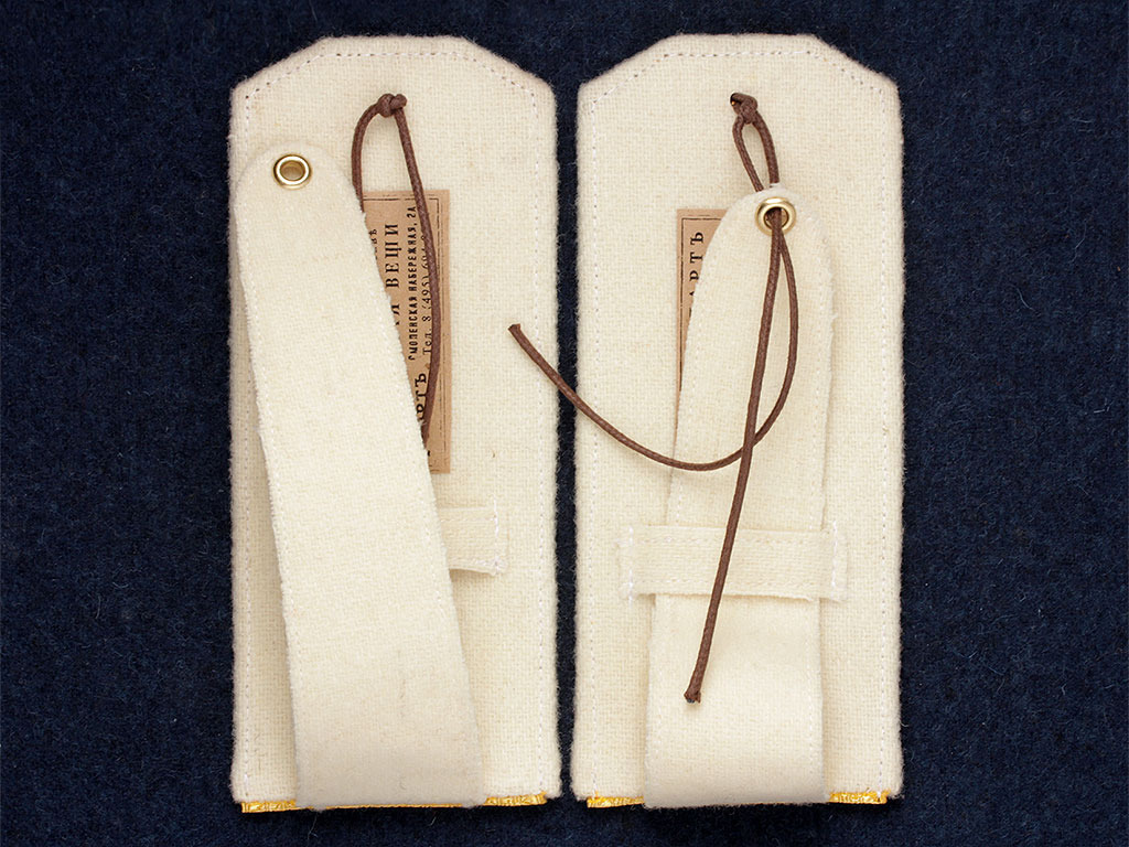 Качественная копия погон капитана первого ранга - преподавателя старейшего военно-учебного заведения Российской империи: Морского кадетского корпуса. Золотой галун, белое поле, белый кант. Установлены золоченые пуговицы с изображением якорей (использовались до 1904 года, позже - с изображением Государственного герба на якорях).