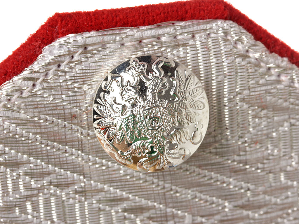 Погоны генерал-фельдмаршала для ношения при форме Лейб-гвардии Саперного батальона и тех подразделений, коим положен белый прибор. Белое металлизированное серебряное поле с зигзагообразной генеральской вышивкой, красный (алый) кант, шитый золотом вензель Императора Николая II, наложенный на скрещенные маршальские жезлы. Серебряные пуговицы с изображением Государственного герба.