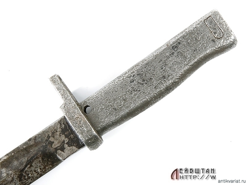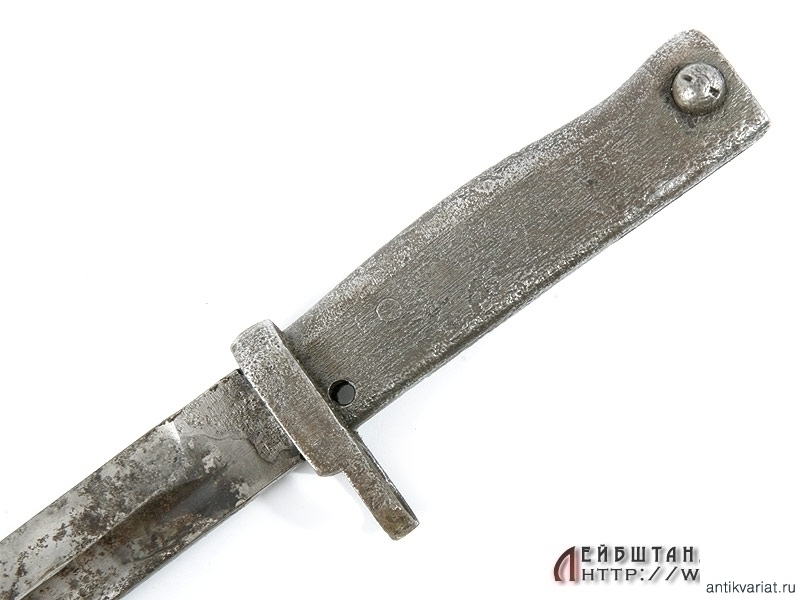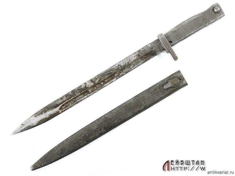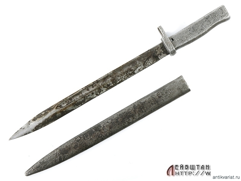 Довольно редкий эрзац-штык к винтовке Маузер в средней степени сохранности. Клинок на обухе помечен клеймом военной приемки. Рукоять цельнометаллическая, с кнопкой. Ножны также металлические. Штыки эрзац-выпусков появились в конце Первой мировой войны: их производство было связано с нехваткой стандартных штыков для вооружения армии и стремлением удешевить производство. Использовались и во Вторую мировую.