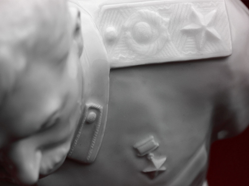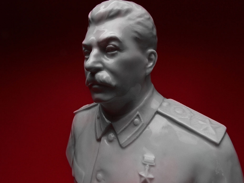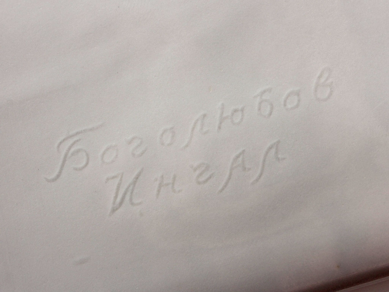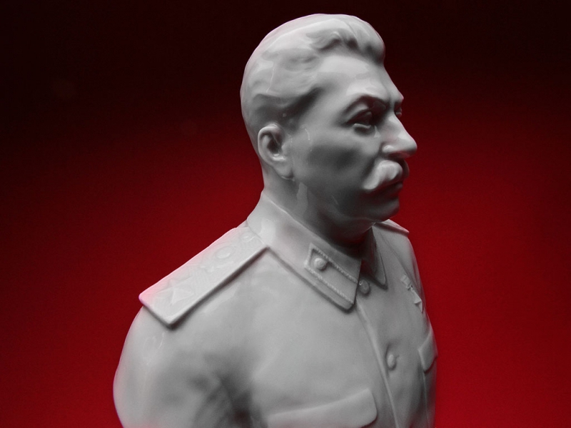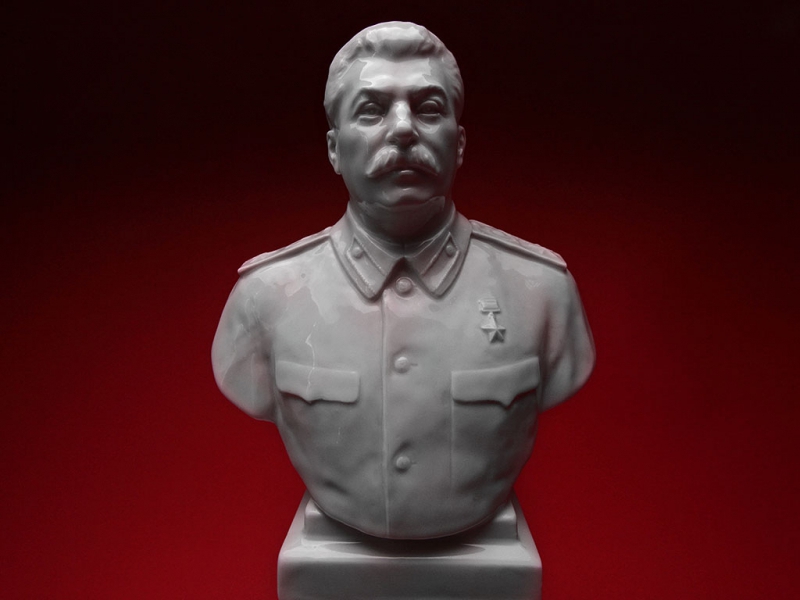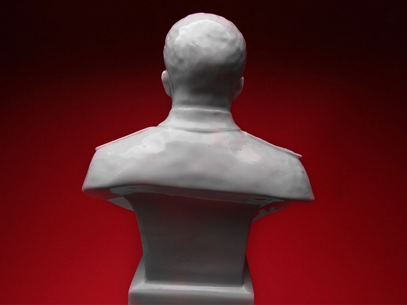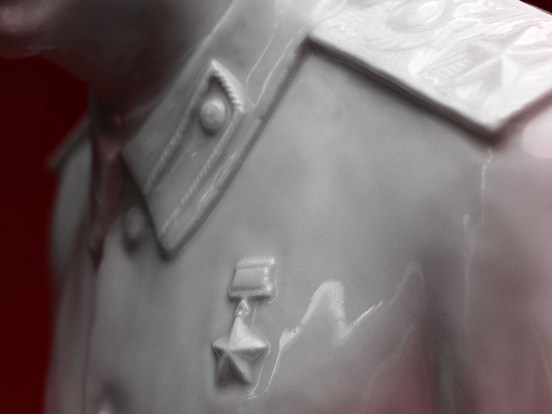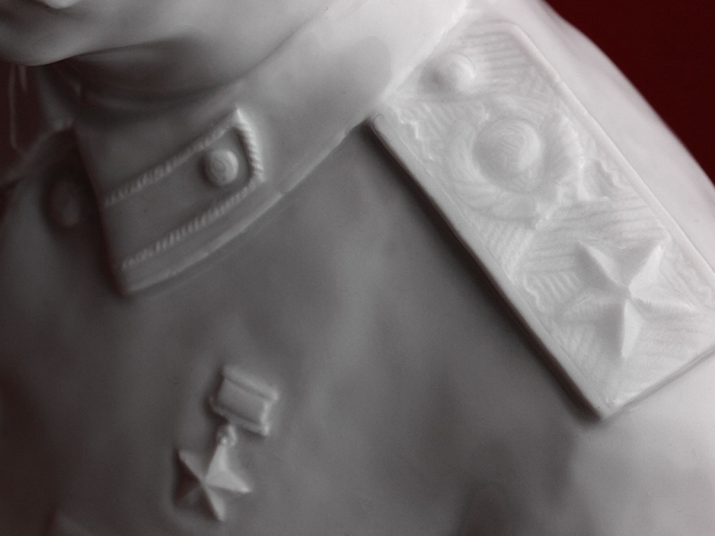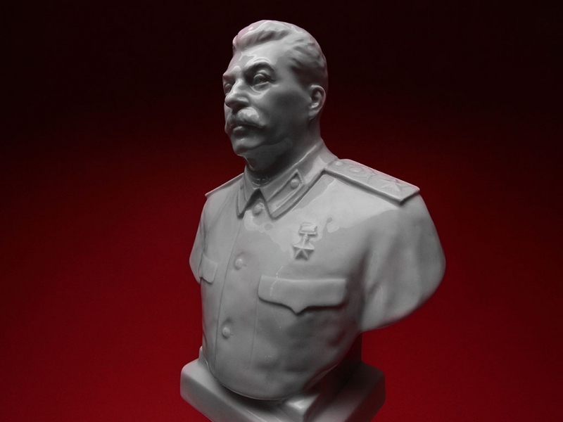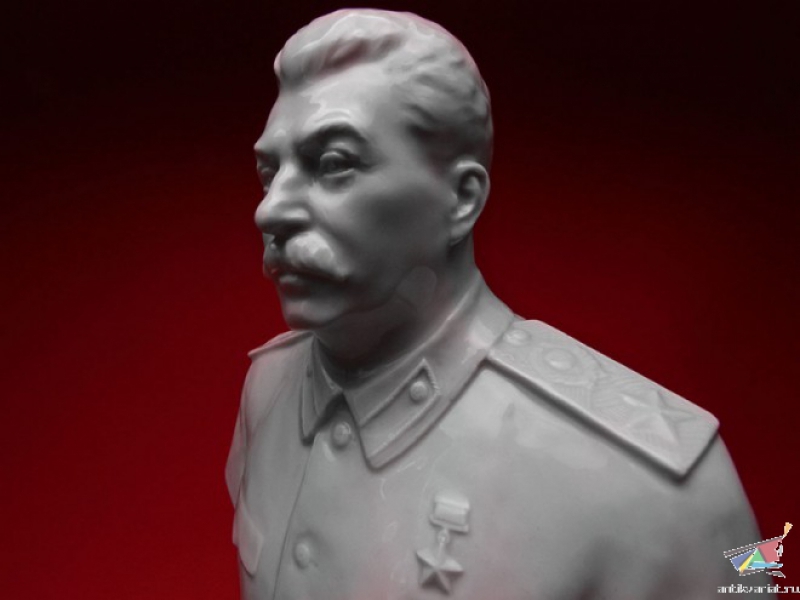 Настольный бюст Иосифа Виссарионовича Сталина в парадной форме генералиссимуса, изготовленный из белого глазурованного фарфора на Ленинградском фарфоровом заводе в конце 1940-х годов. На дне - подглазурное синее клеймо "ЛФЗ", отличное состояние, без сколов и трещин. На срезе - подпись автора модели в тесте "Боголюбов Ингал".