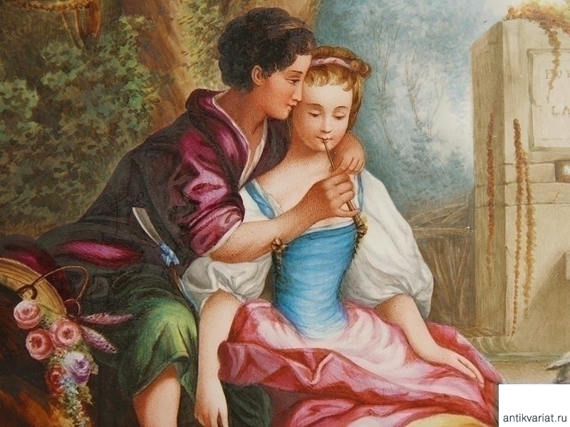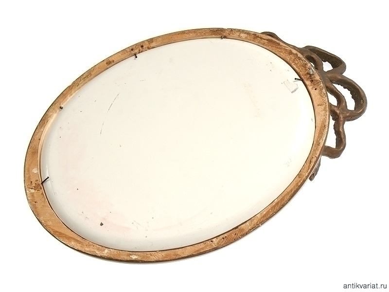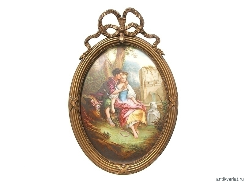 Большой декоративный настенный фарфоровый пласт с живописной пасторальной сценой. Без подписи мастера. В деревянной резной раме с лепной розеткой. Начало ХХ века. Отличное состояние.