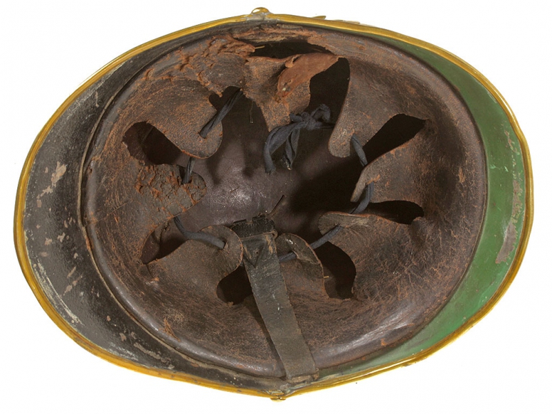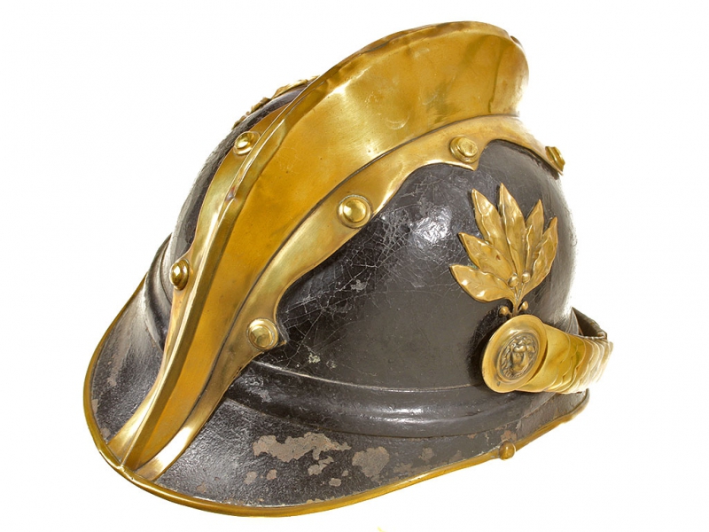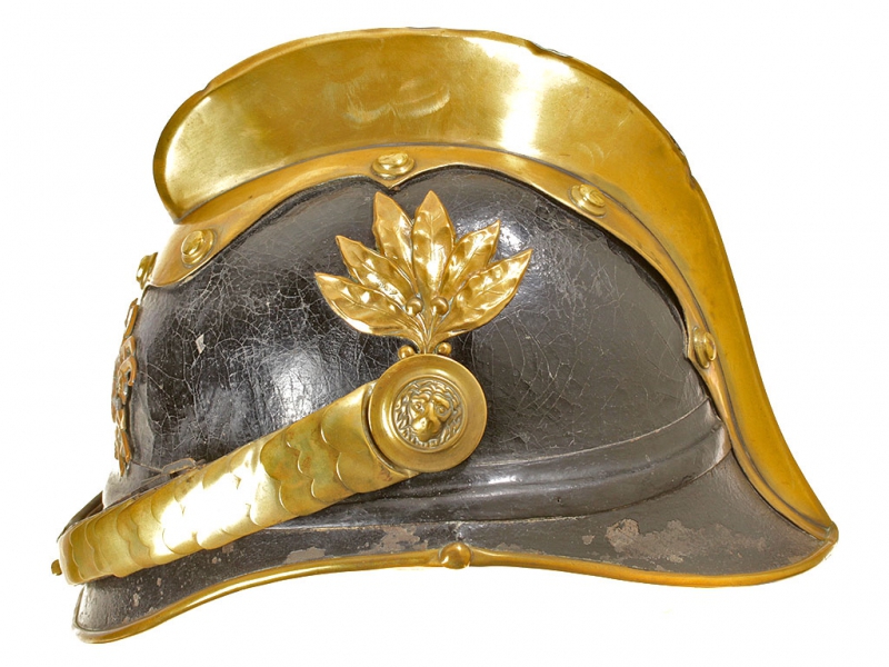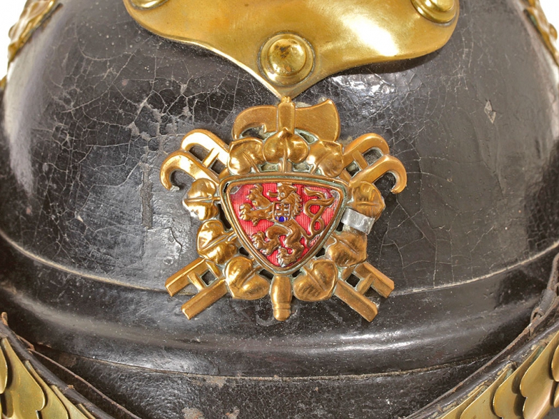Шлем пожарного для рядового состава, 1930-е годы. Основа из черной лаковой кожи, накладной герб с изображением чехословацкого льва в окружении пожарной атрибутики. Шлем в очень хорошем состоянии, все металлические части изготовлены из латуни. Оригинальный подшлемник 56-го размера.