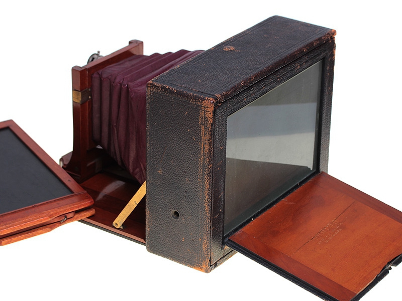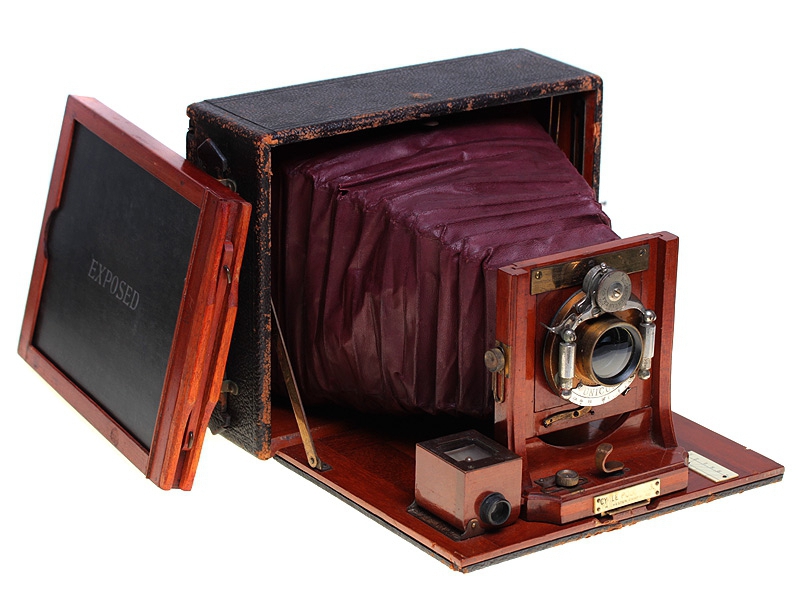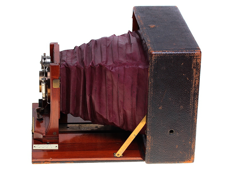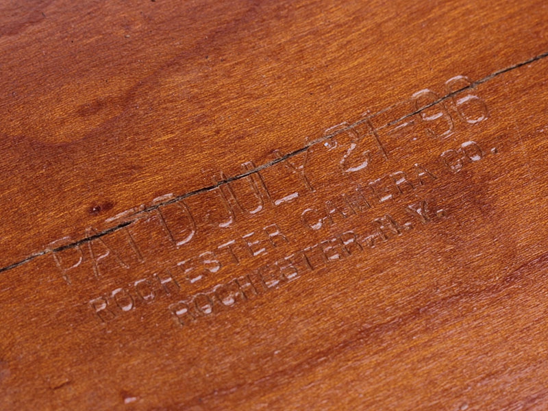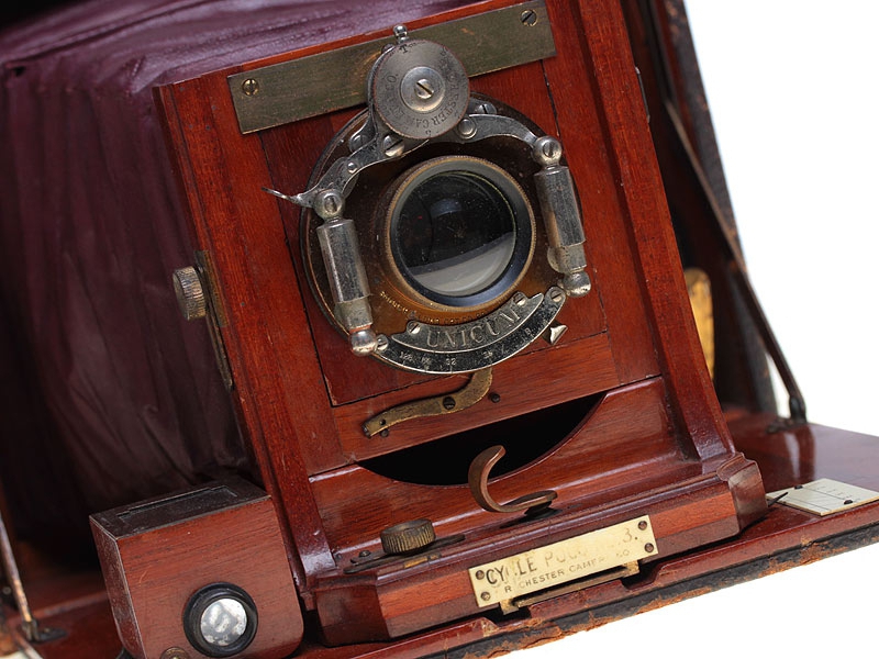 Американская форматная камера в деревянном корпусе для павильонных съемок формата 5х7 дюймов "CYCLE POCO No. 3" с кассетой известной мануфактуры "Rochester Camera". Изготовлена 21 июля 1896 года в Нью-Йорке. Корпус камеры - из красного дерева, покрытого лаком, с дорогим красным кожаным мехом и латунной фурнитурой с золотистым лаковым покрытием. На корпусе камеры имеется механический уровень в виде шарика, вмонтированный в видоискатель. Латунный объектив "Baussch & Lomb." в затворе "Unicum".