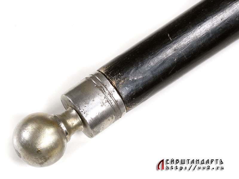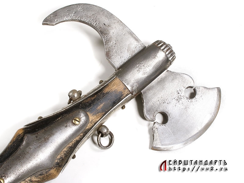 Форменный топорик - деталь униформы пожарного. Рабочая часть представляет собой топор с фигурным вырезом, противоположная часть загнута в виде уплощенного крюка. Древко фигурное деревянное, выкрашенное в черный цвет, в значительной степени сохранилось оригинальное лаковое покрытие. В центральной расширяющейся части древко снабжено двумя накладными пластинами, которые крепятся к основе при помощи латунных винтов. Вверху древка две накладки с кольцами для подвешивания.