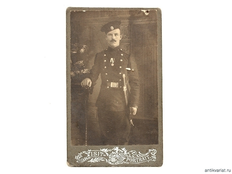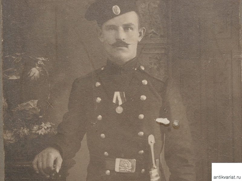 Фото артиллериста, вооруженного бебутом, с медалью "300 лет дому Романовых" на груди. 1910-е годы.