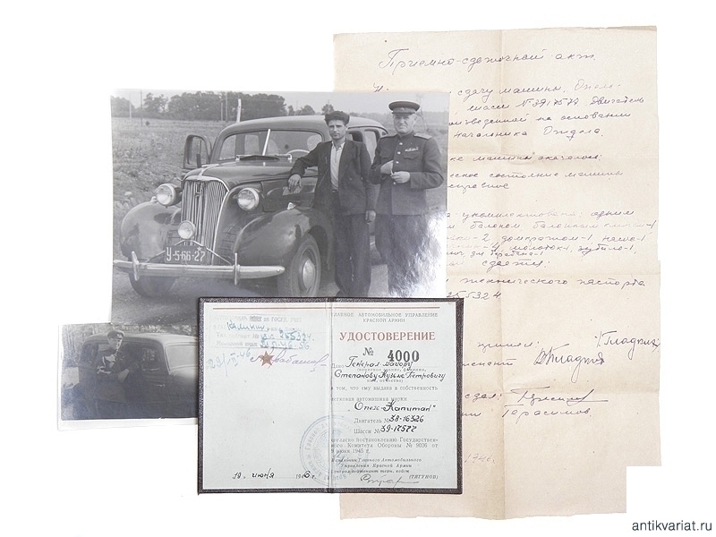 Лот из фотографий и удостоверения на выданную в личное пользование генерал-майору автомашину "Опель-капитан". 1946 год. Отличное состояние.