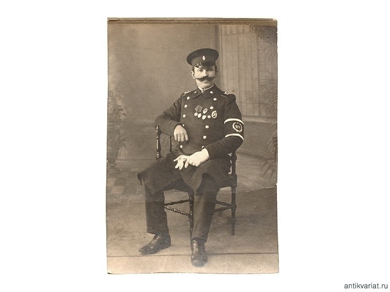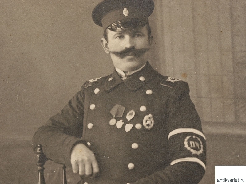 Фото пожарного начала ХХ века в полной форме с нарукавной повязкой. Наклеено на картон, размер: 9 х 13 см.