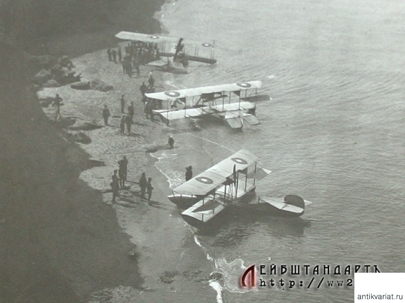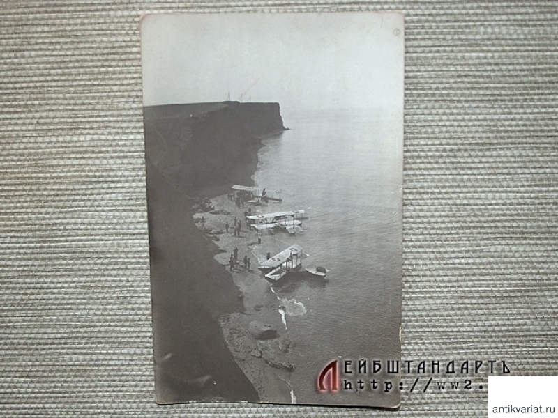 Крайне редкий снимок времен Первой мировой войны. Сфотографированы пришвартованные к морскому берегу гидропланы. Необходимо отметить отличную композицию снимка. Оборотная сторона оформлена в качестве открытки, это часто делалось, даже выпускалась специальная фотобумага, чтобы отпечатанный снимок можно было отправить по почте в виде открытого письма.