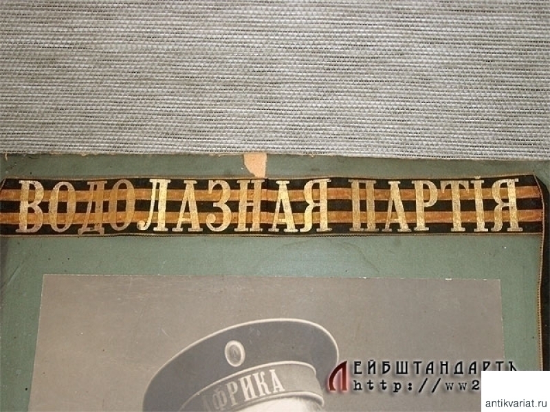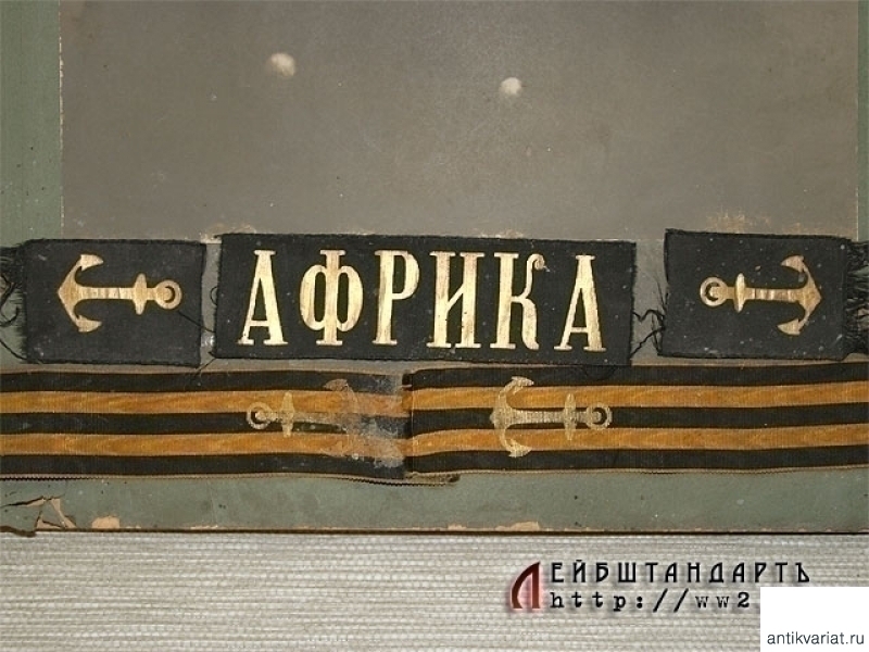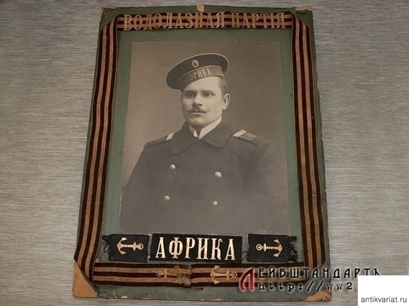 Большая портретная фотография унтер-офицера водолазной партии корабля "Африка" Балтийского флота. Фото наклеено на оригинальное паспорту и по периметру оклеено Георгиевской лентой с надписью "Водолазная партия", а внизу прикреплен фрагмент ленты с названием корабля: "Африка". Редкий интерьерный предмет в хорошей сохранности.