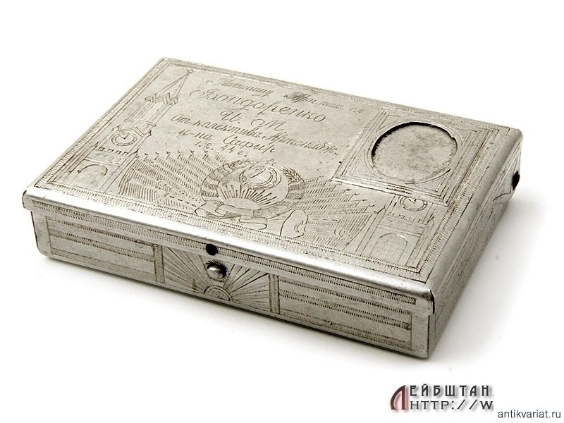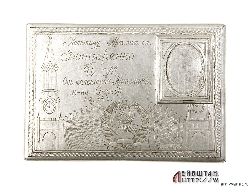 Фронтовой алюминиевый портсигар, подаренный капитану артиллерийской технической службы И.М.Бондаренко коллективом артснабжения 1 февраля 1944 года. Украшен ручной гравировкой, оставлено место для вставной фотографии. Предмет в очень хорошей сохранности.
