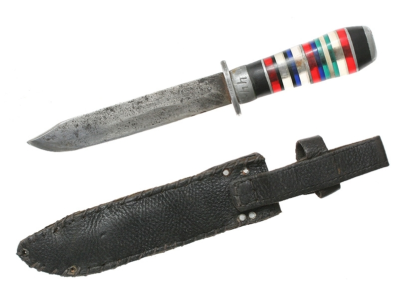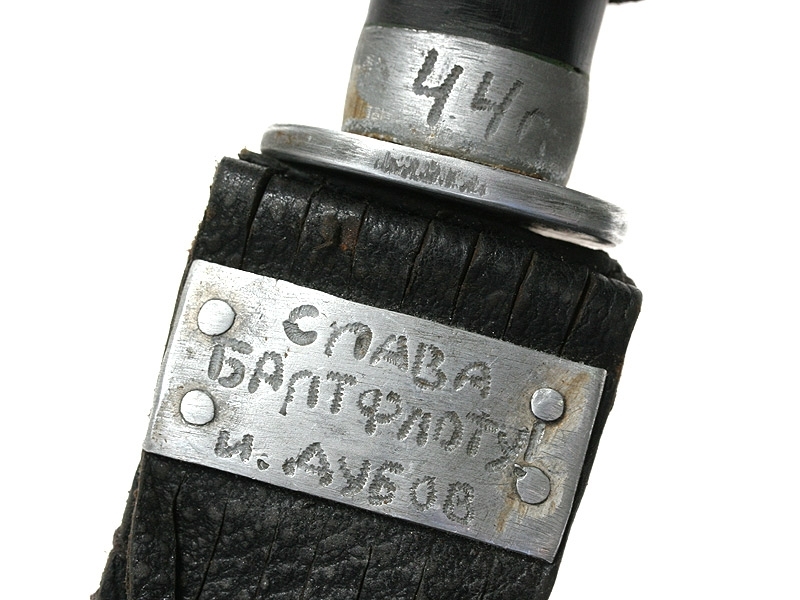 Нож произвольного типа с наборной разноцветной пластиковой ручкой - фронтовое изготовление периода Второй мировой войны. На алюминиевой втулке рукояти - гравировка в виде пятиконечной звезды и дата: 1944 год. Ножны кожаные, с табличкой: "Слава Балтфлоту! И.Дубов".