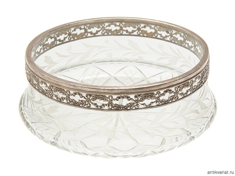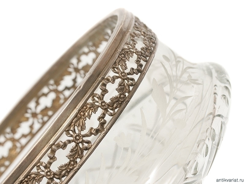 Стеклянная фруктовница с ажурным серебряным ободком. Имеется клеймо французского пробирного надзора. Начало ХХ века.