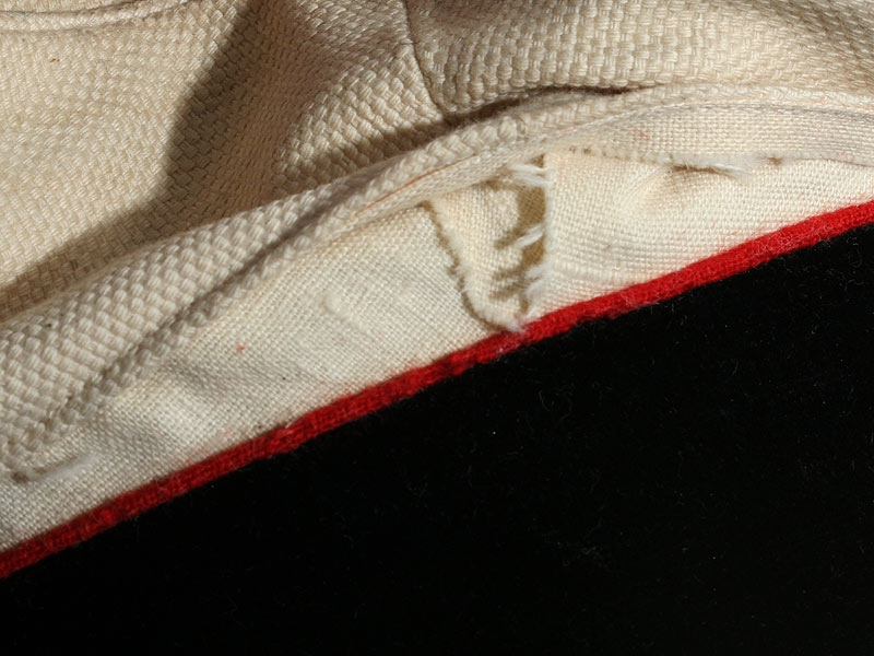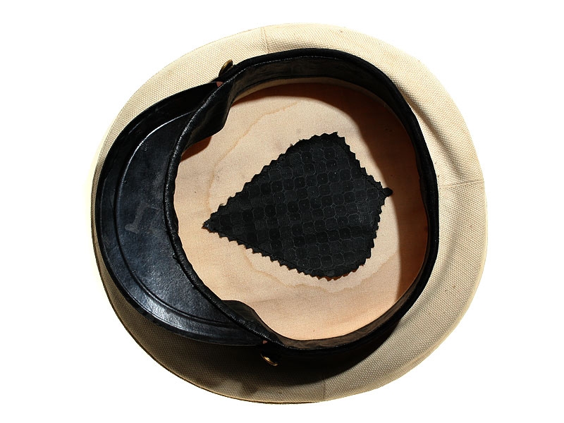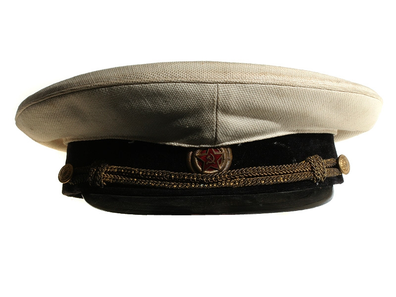 Фуражка летняя повседневная генерала автобронетанковых войск РККА образца 1940 года. Околыш из черного бархата, тулья и донышко белые. По верхнему краю околыша и по краю тульи идет красный кант. Сохранился оригинальный белый матерчатый чехол. Козырек фибровый, черный, лакированный, удлиненной формы. Над козырьком к позолоченным форменным латунным пуговицам с изображением герба СССР пристегнут плетеный золотистый шнур. Генеральская кокарда круглой формы, с эмалевой звездой и полем, оригинально установлена. Размер 56.