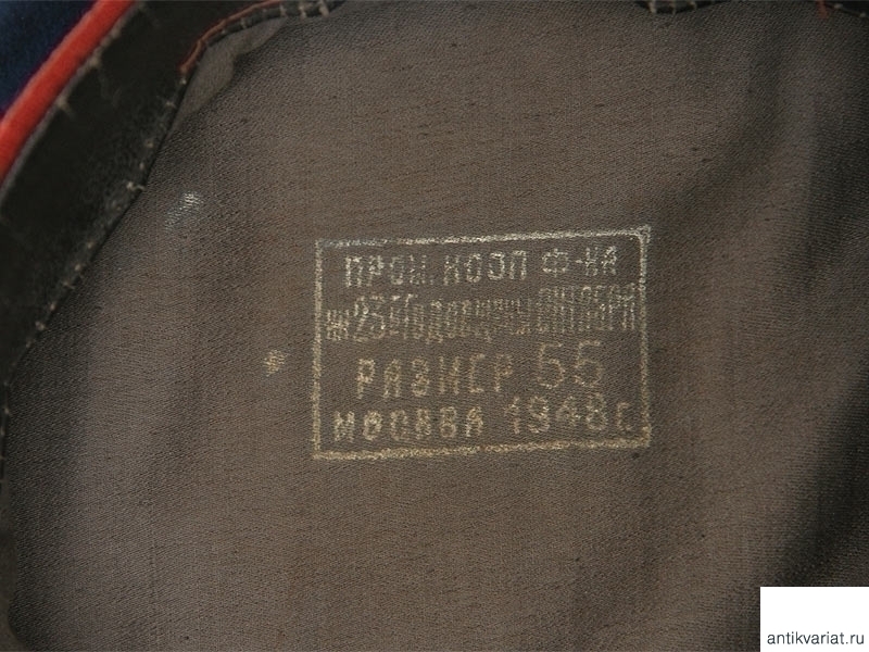 Фуражка немного побита молью, на подкладке стоит клеймо фабрики и год выпуска - 1948 год. На околыше стоит эмалевая звезда. 55 размер.