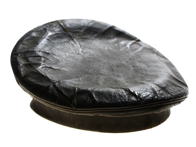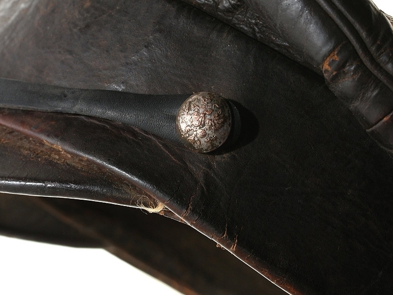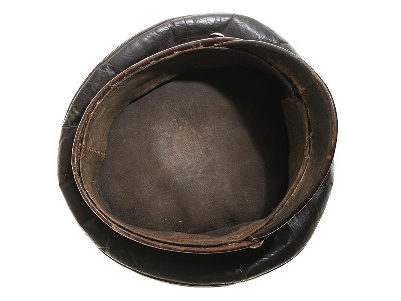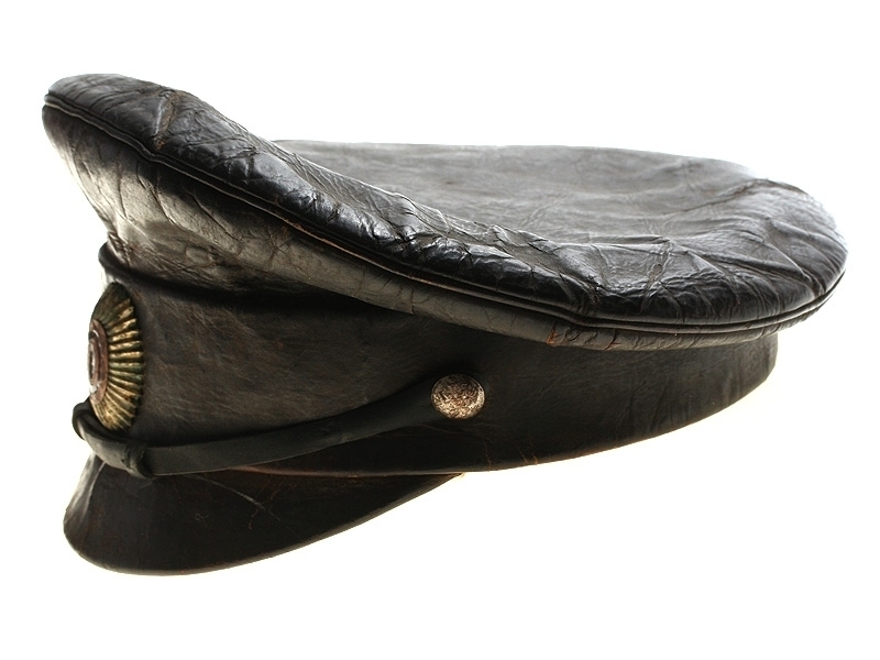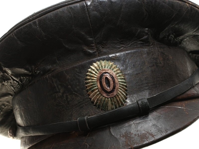 Фуражка офицера автомобильных частей, либо бронечастей, либо военного летчика периода Первой мировой войны. Пошита из темно-коричневой плотной кожи, козырек с изнанки проклеен дерматином, изнутри - тканевая подкладка. Офицерская кокарда не переставлялась, подбородочный ремешок установлен позднее.