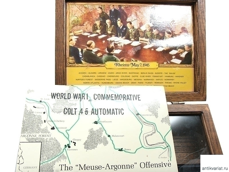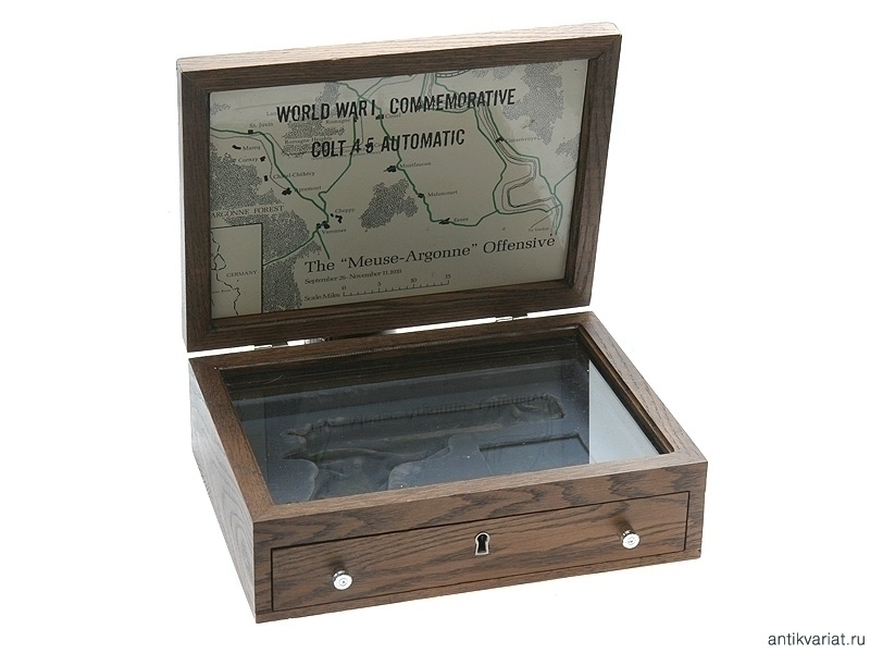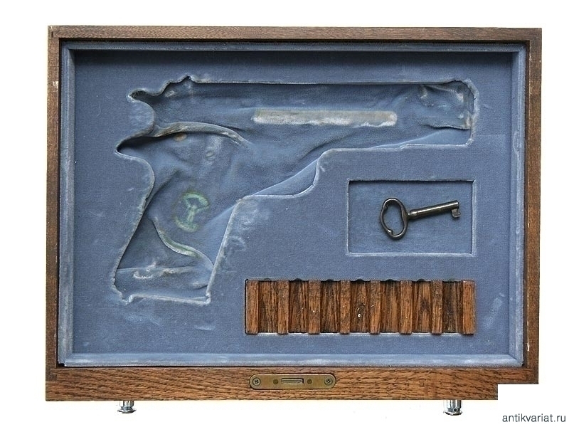 Футляр довоенного изготовления для хранения пистолета Кольт образца 1911 года. Деревянный ящик с выдвижным низом, обтянутый изнутри бархатом, с гнездом для хранения пистолета и дополнительным - для хранения патронов.