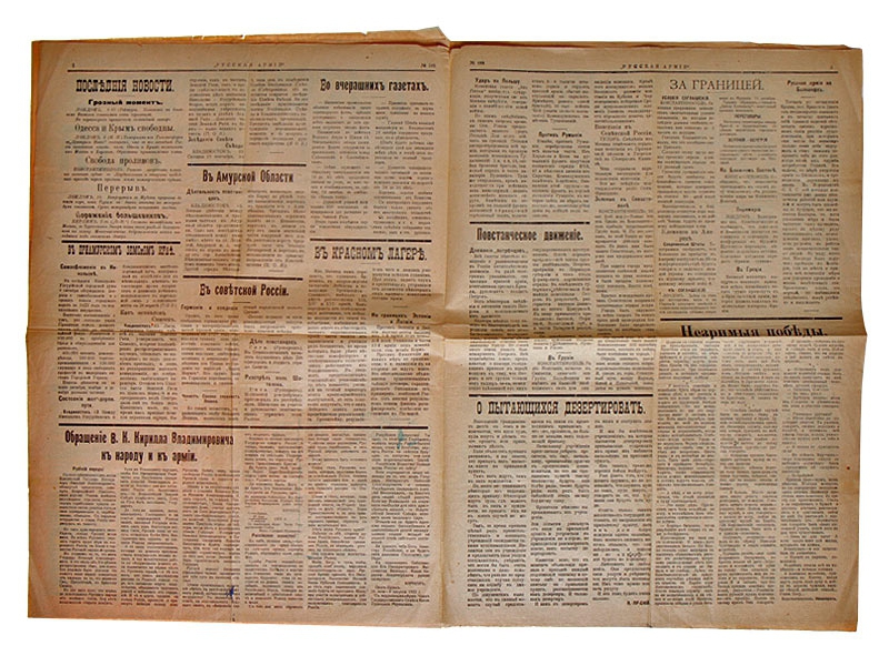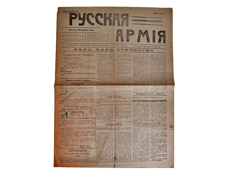 Газета "Русская Армия" - белогвардейское периодическое издание, указанное в ранних номерах как "Орган Земской Рати", а в более поздних - как "Орган Дальневосточной Армии". Газета издавалась во Владивостоке трижды в неделю.