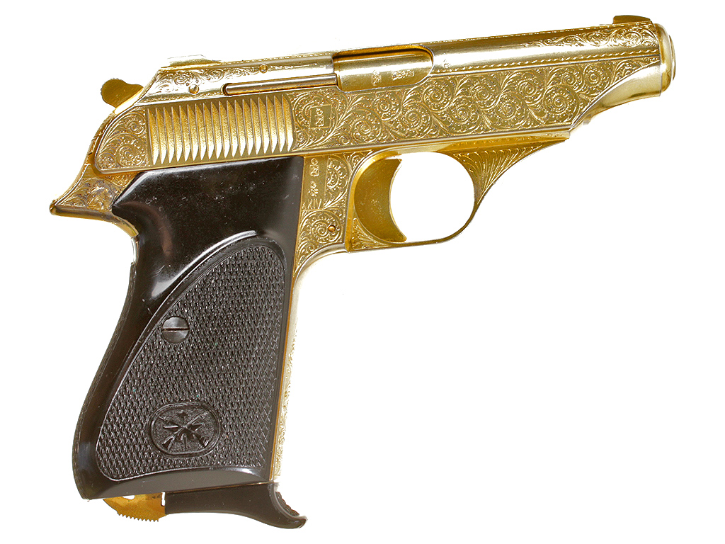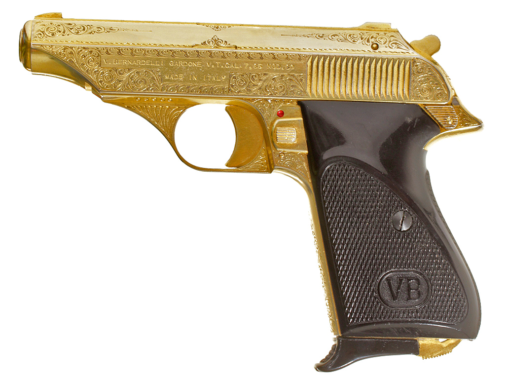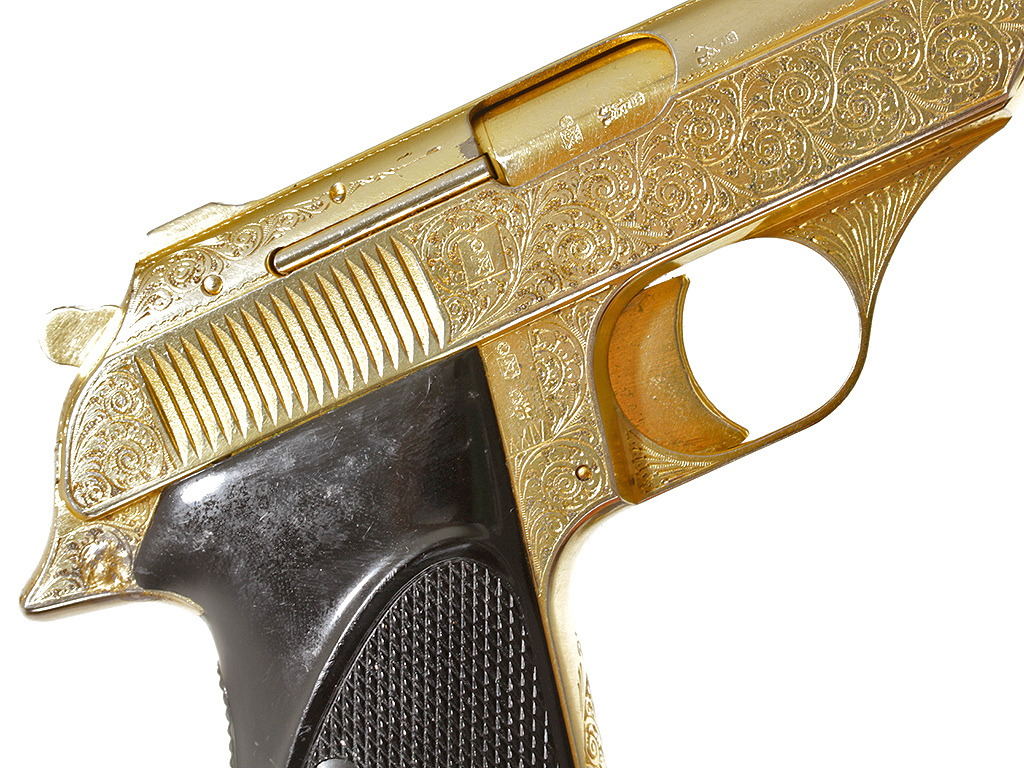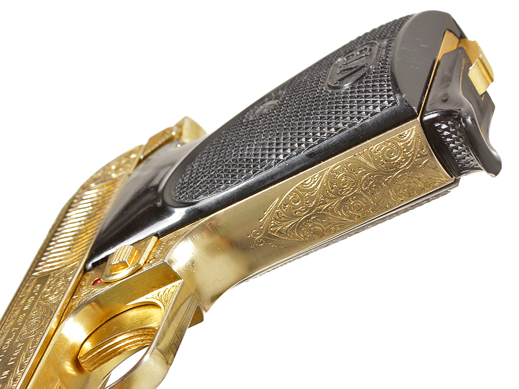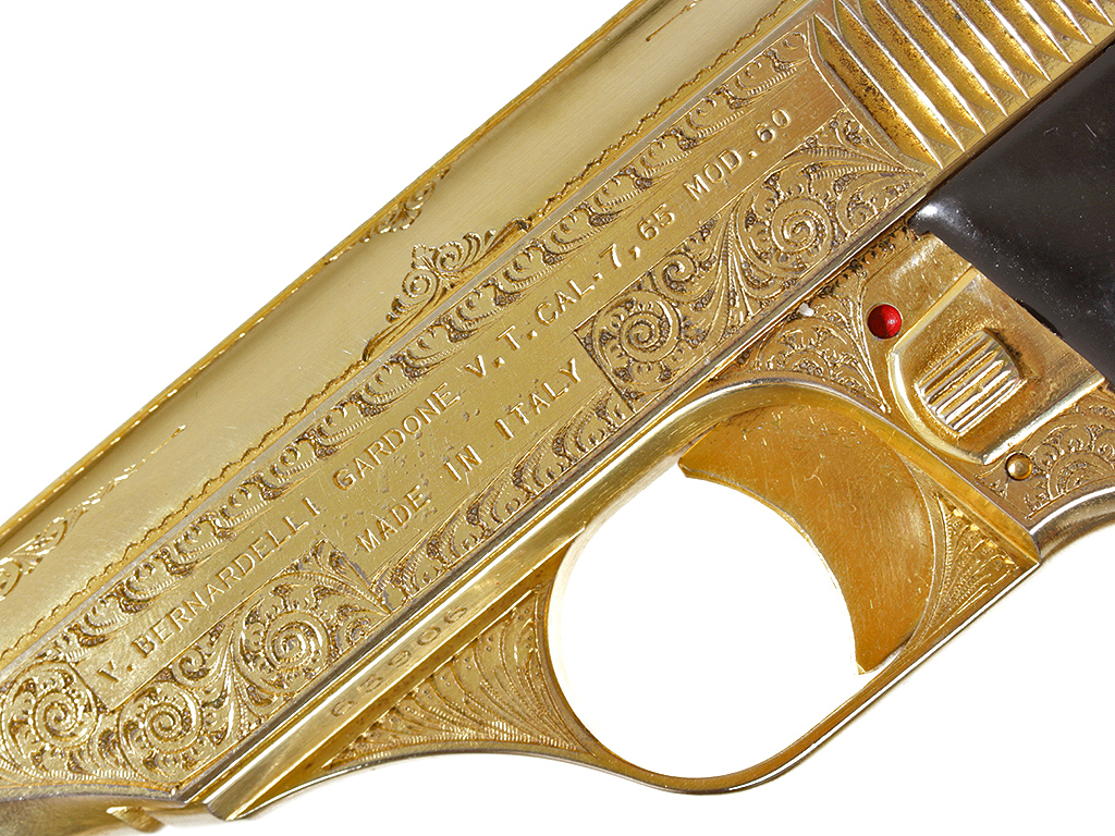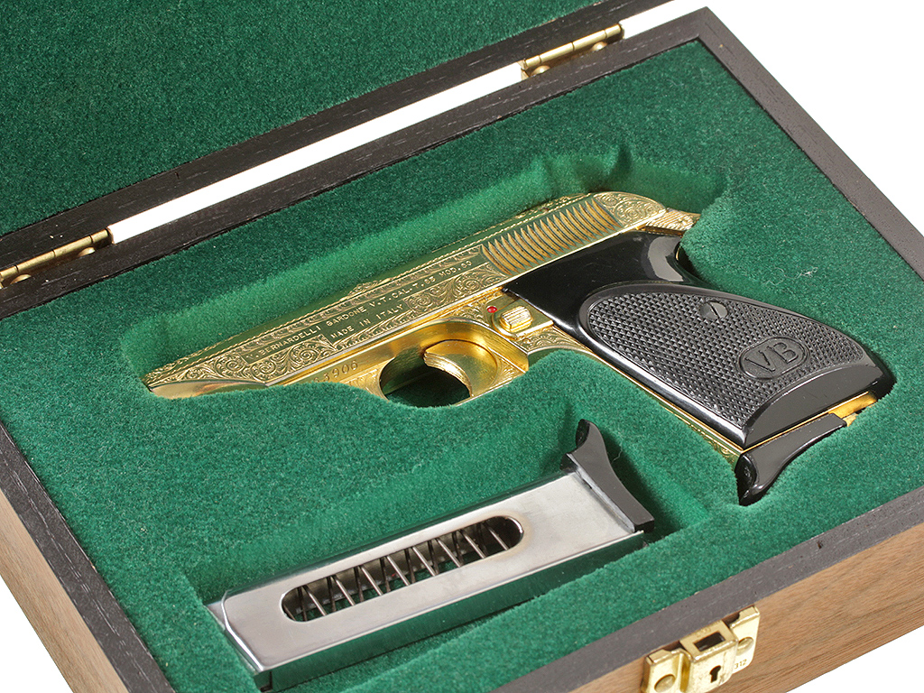 Пистолет Бернарделли (модель образца 1960 года) калибром 7,65 мм. Отличное состояние, высококачественное исполнение. Корпус пистолета украшен гравированным орнаментом и позолочен. В подарочном футляре с запасным магазином в комплекте.