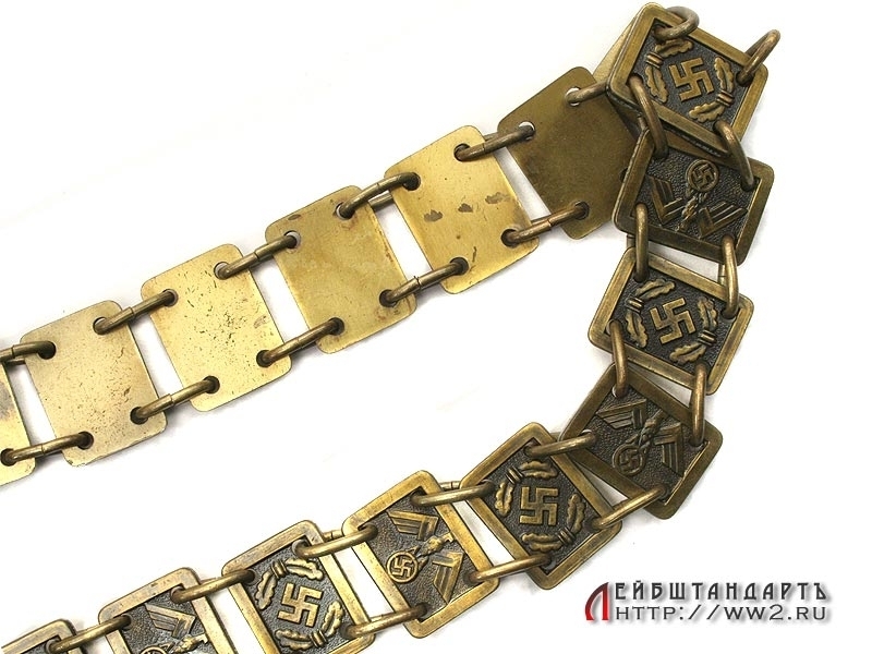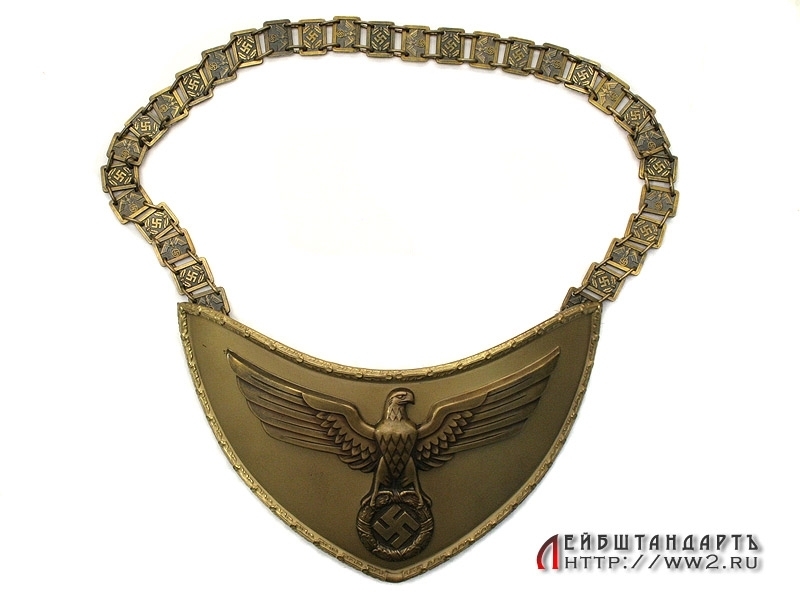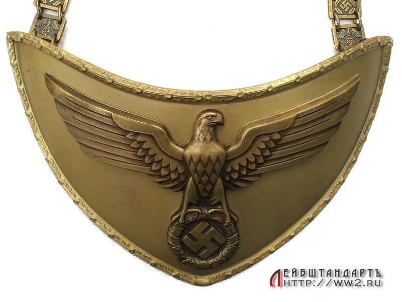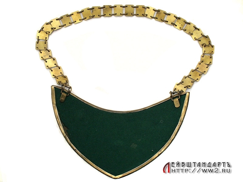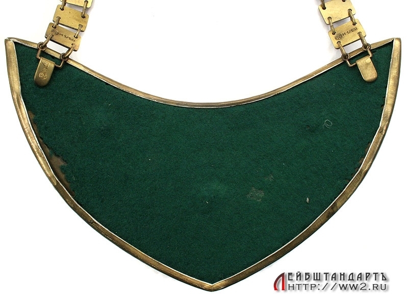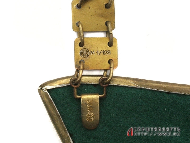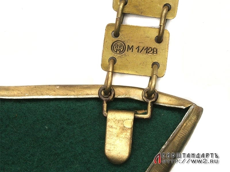 Один из самых красивых горжетов Третьего рейха - горжет знаменосца NSDAP. Размер горжета - 22,5 Х 11,5 см. Изготовлен из цинкового сплава, бронзирован и покрыт оригинальным лаковым покрытием, превосходно сохранившимся. Орел накладной. Изнутри горжета присутствует зеленая суконная подложка. На крюке - клеймо изготовителя М 1/128 и код RZM. Горжет снабжен оригинальной цепью, на начальных звеньях которой присутствуют те же клейма. Редкий предмет в превосходной сохранности, хорошо дополнит коллекцию холодного оружия в домашнем интерьере.
