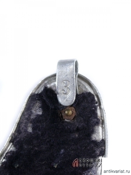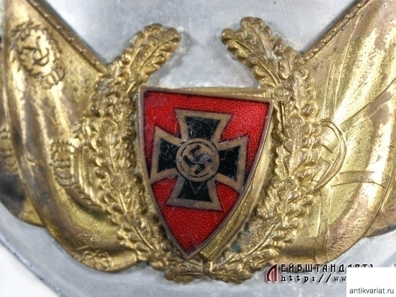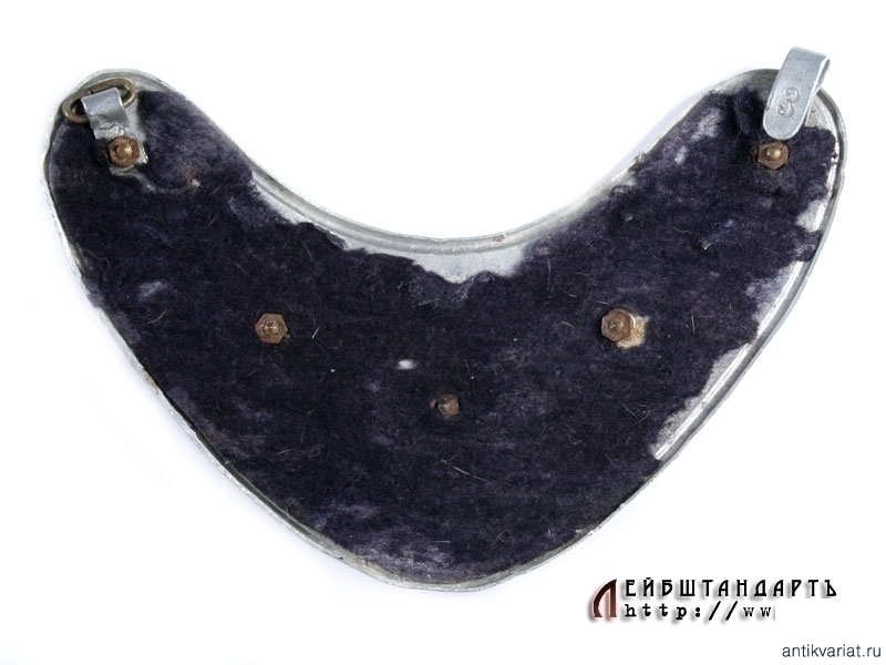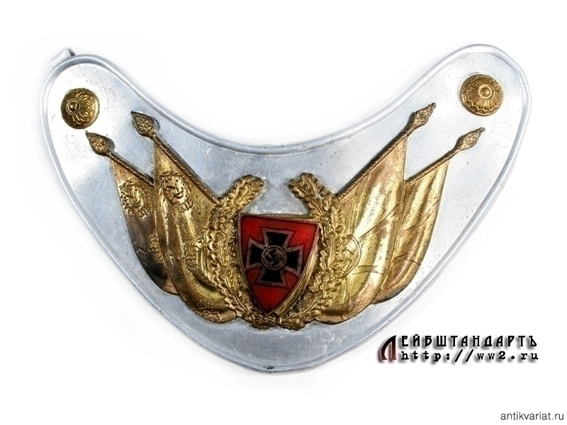 Горжет Знаменосца NSKOV - Национал-Социалистического союза офицеров - ветеранов Первой мировой войны. Представляет собой никелированную пластину с накладкой в виде позолоченных знамен с эмалевой эмблемой организации в середине. Цепь отсутствует. Практически полностью сохранилась синяя суконная подложка. На крюке присутствует клеймо в виде цифры "3". Редкий предмет в очень хорошем состоянии. Будет превосходно смотреться в интерьере как дополнение коллекции холодного оружия.