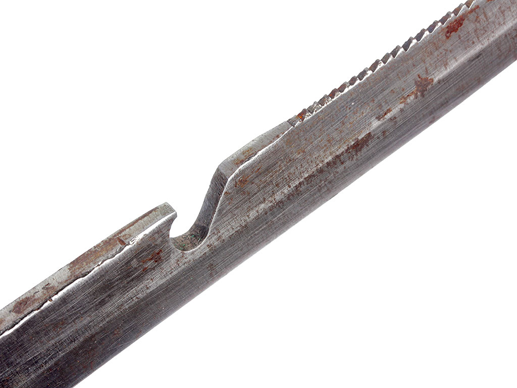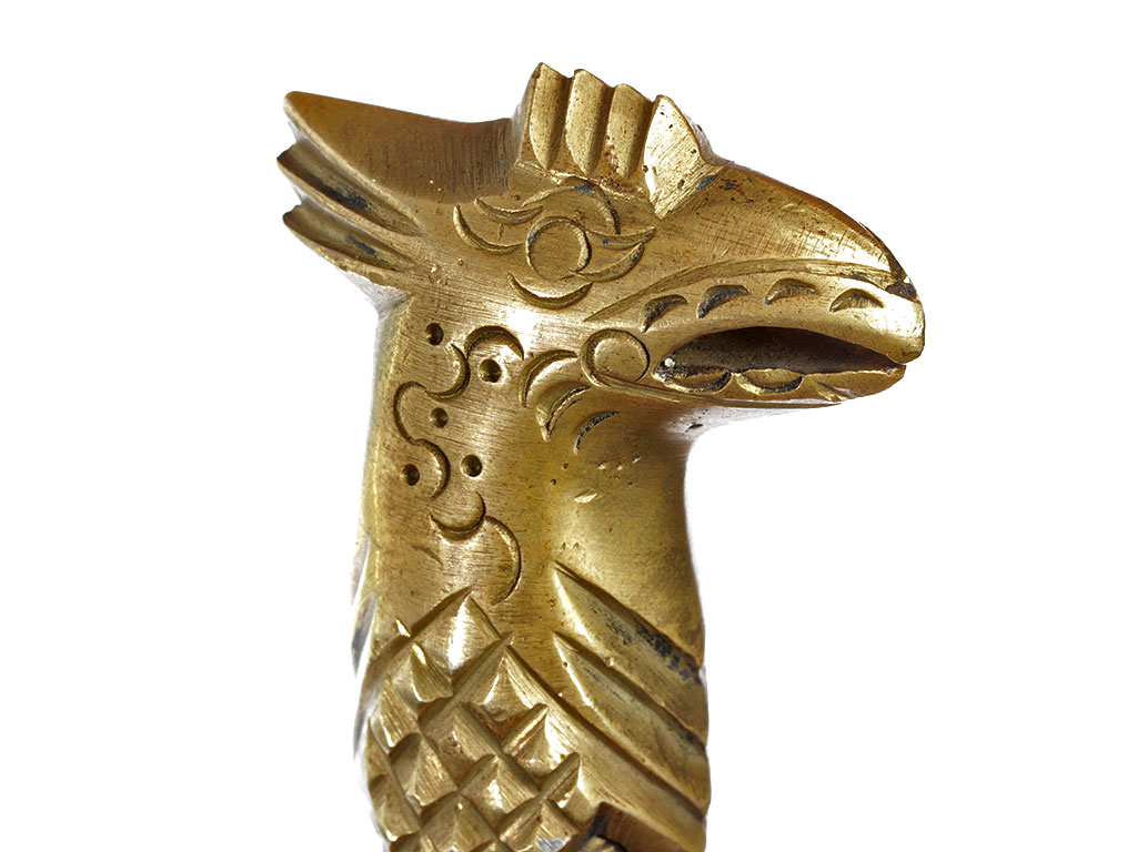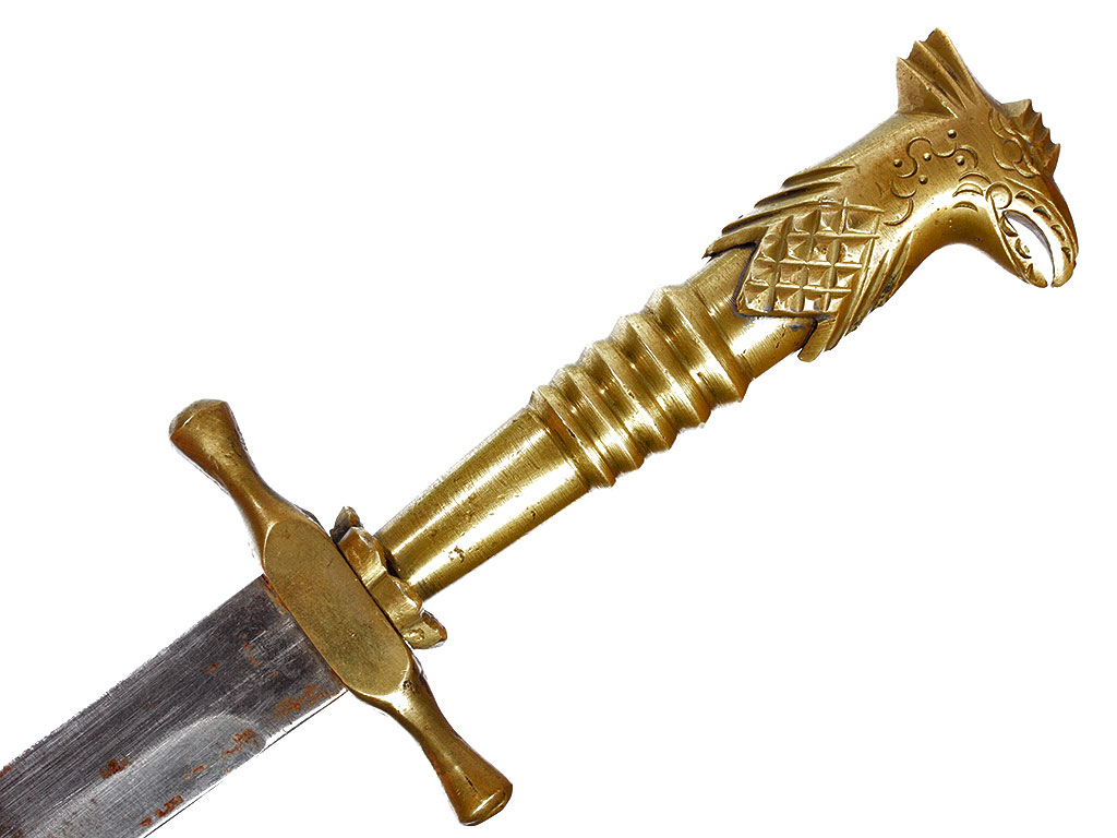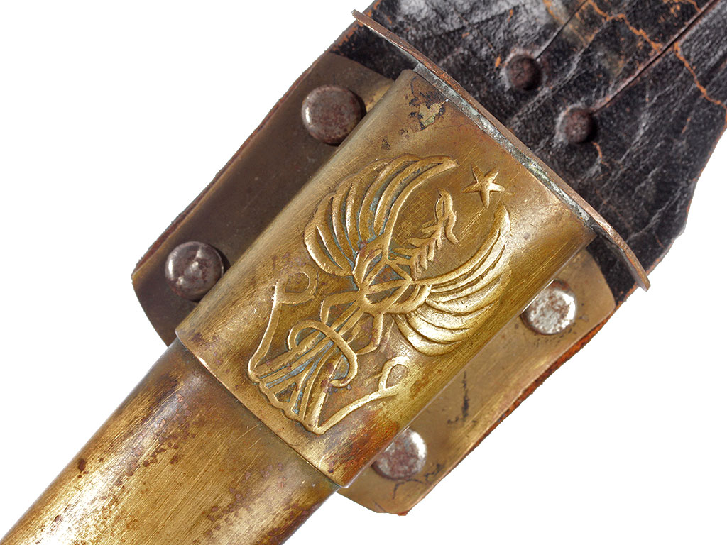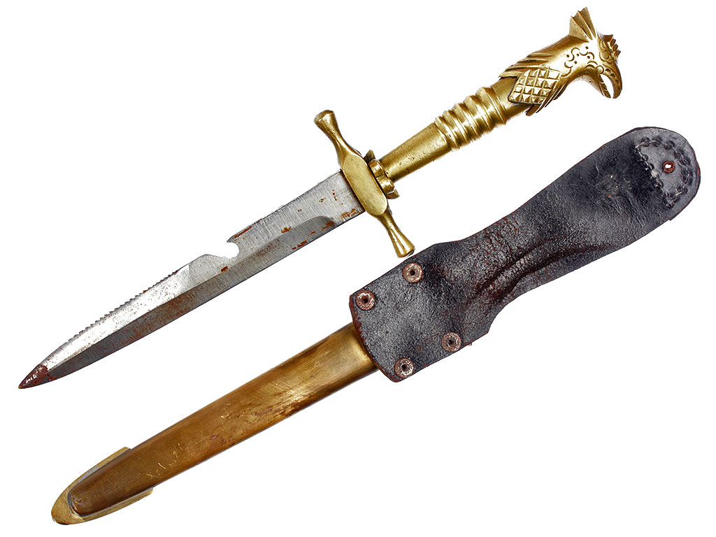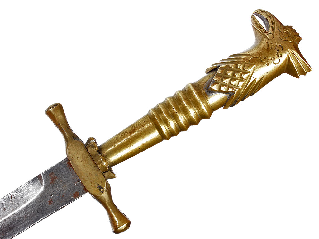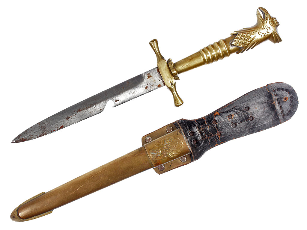 Парадный армейский форменный нож. Клинок однолезвийный (боевой конец двулезвийный), с пилой и вырезом - открывалкой для бутылок. Рукоять латунная, с рельефными поперечными желобками в центральной части. Навершие - в виде стилизованной головы орла. Перекрестие латунное прямое. Ножны латунные, у основания украшены стилизованным гербовым орлом. Подвес из плотной черной кожи, крепится к основанию ножен при помощи четырех заклепок.
