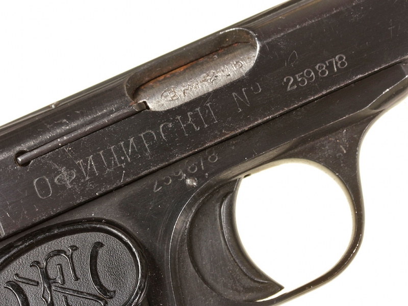 Пистолет Браунинг образца 1922 года, изготовленный в Бельгии для сербской армии. На правой стороне кожуха затвора имеется клеймо "ОФИЦИРСКИ № ...". Очень хорошее состояние, оригинальное воронение, полностью на одном номере.