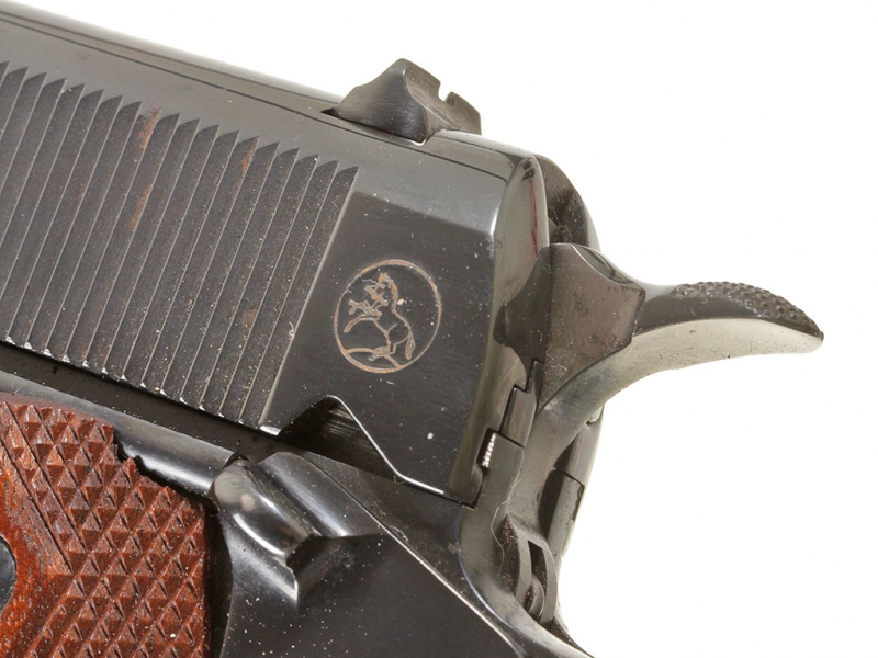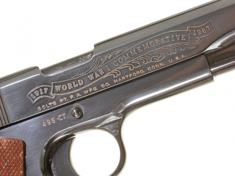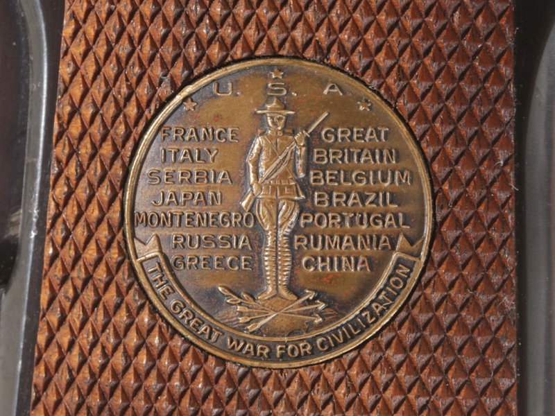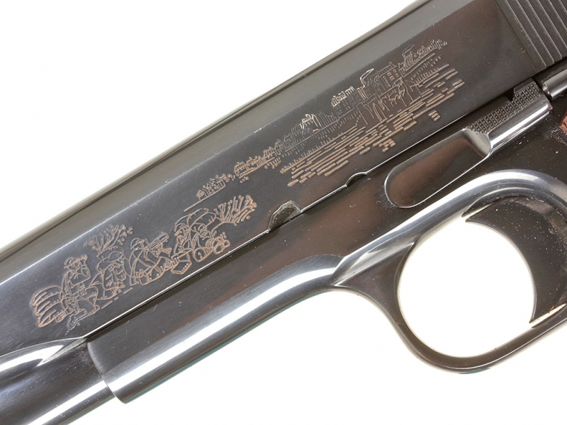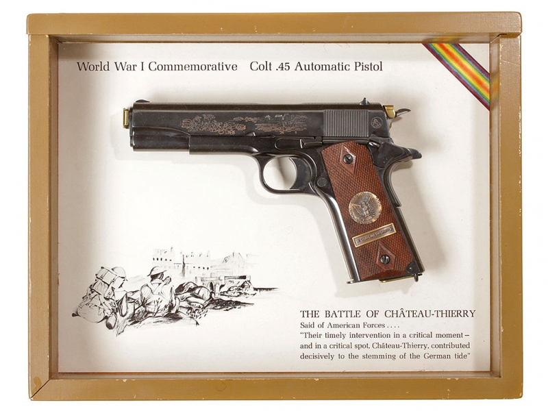 Пистолет Кольт образца 1911 года. Из лимитированной памятной (коммеморативной) серии "Битвы Первой мировой войны". Представленный украшенный экземпляр посвящен 50-летию битвы при Шато-Тьери и помещен в специальный футляр для удобства хранения и демонстрации.