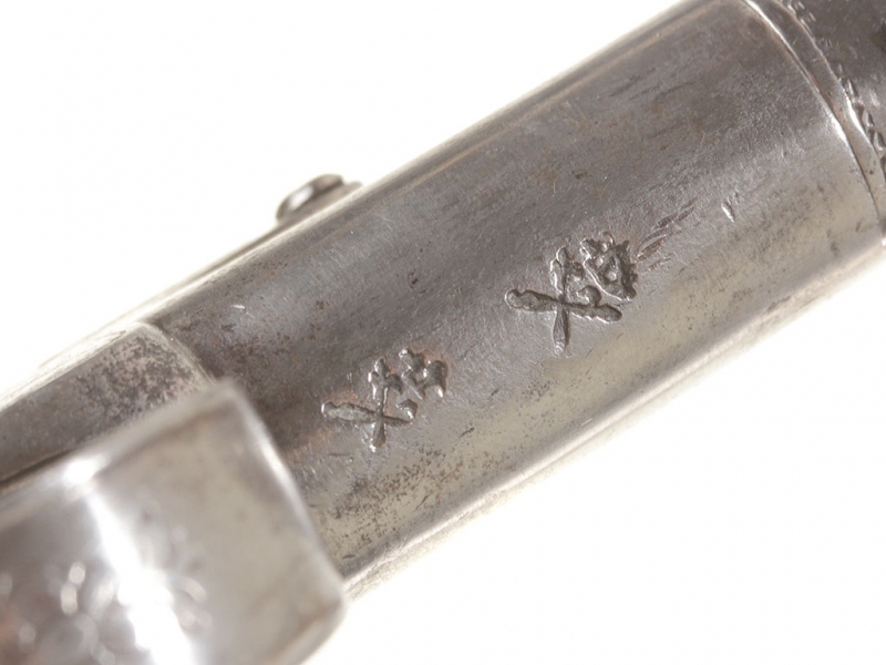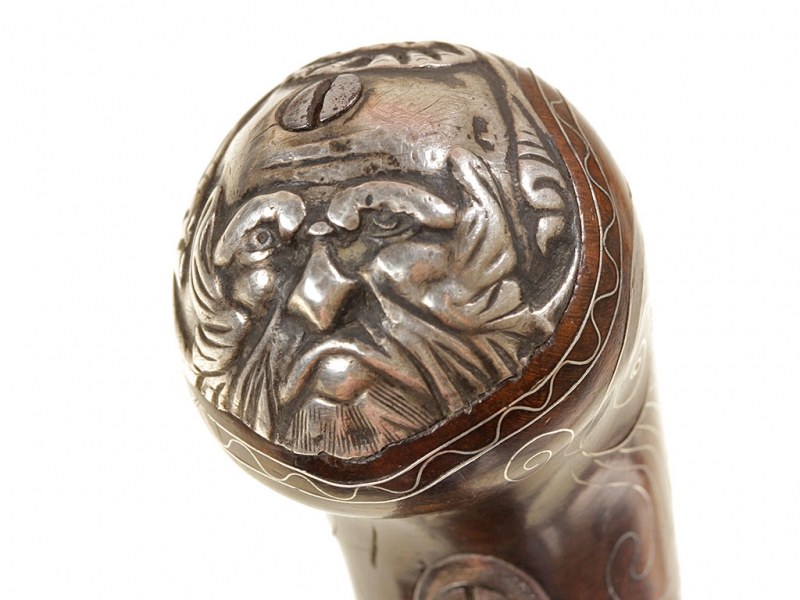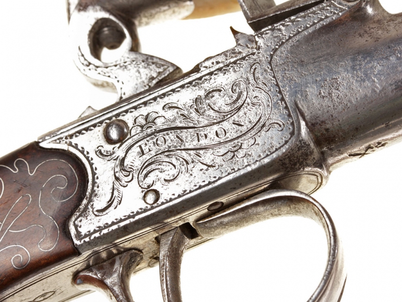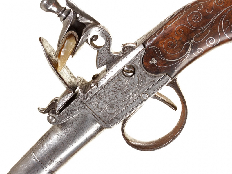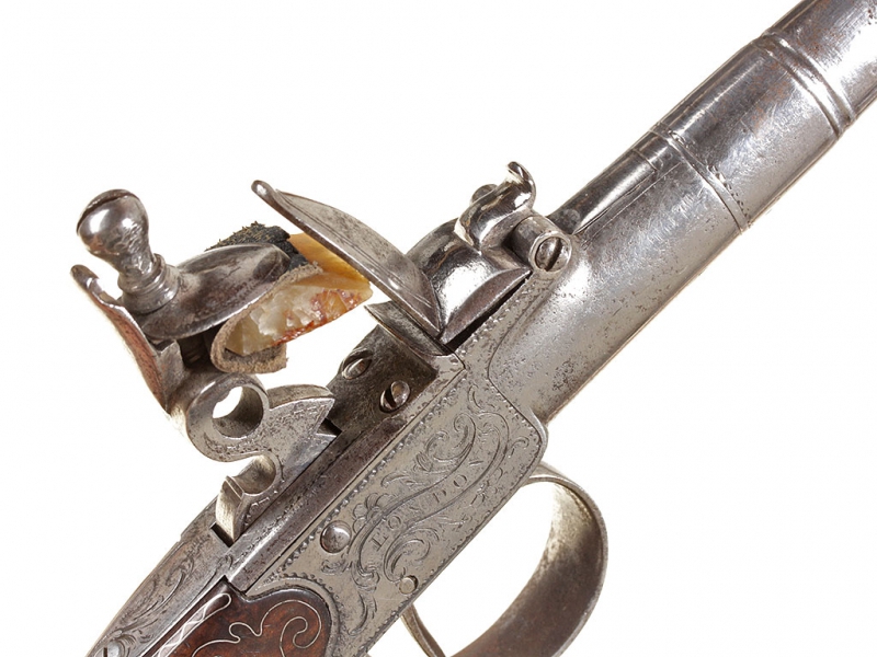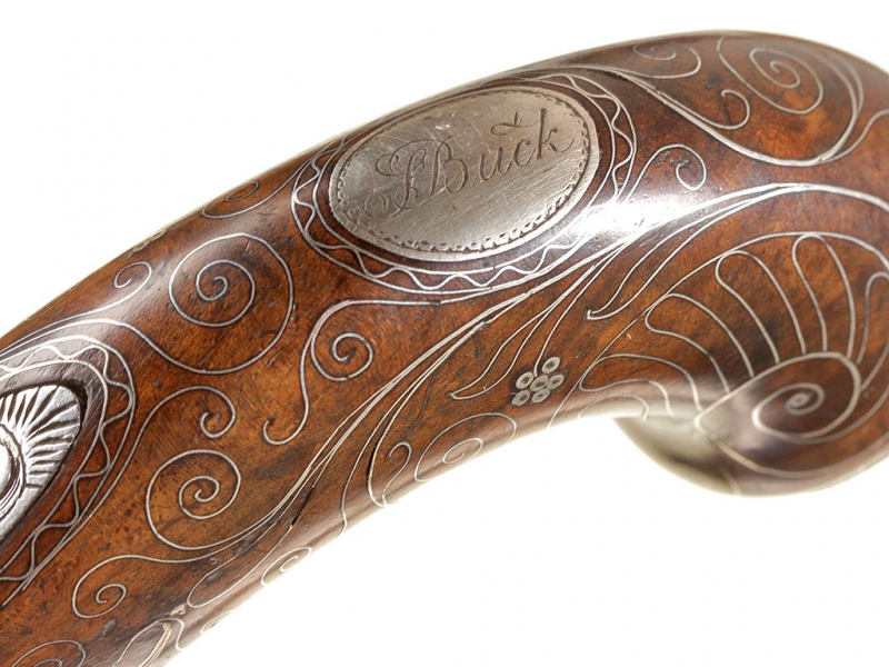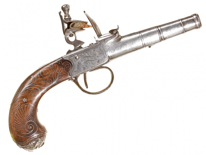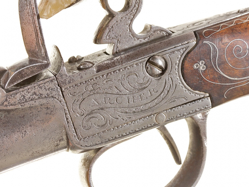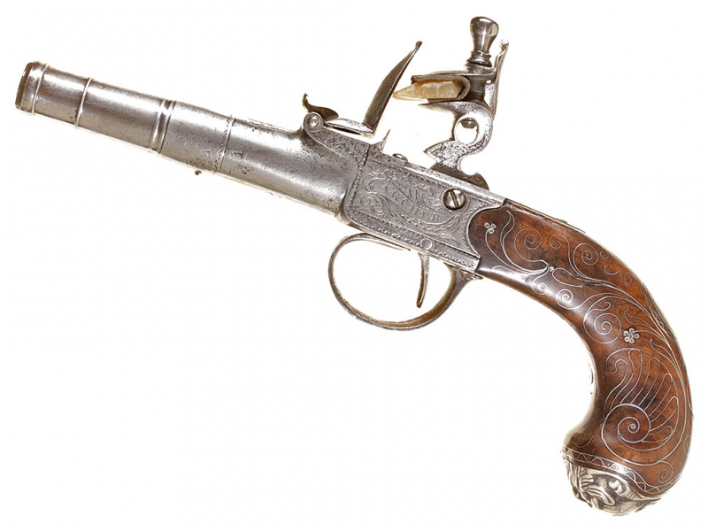 Жилетный пистолет с кремневым замком, изготовленный в первой трети XIX века - классическое оружие самообороны для гражданских лиц. Ствол отвинчивается (для удобства чистки), у основания ствола снизу имеются поверочные клейма. Рама с обеих сторон украшена гравированными орнаментальными картушами, в одном из которых помещены данные изготовителя: "ARCHER" "LONDON". Рукоять из дерева, украшена орнаментом, таушированным серебряной проволокой. Основание рукояти закрыто круглой накладкой в виде бородатой человеческой личины, изготовленной из серебра. Очень хорошее состояние.