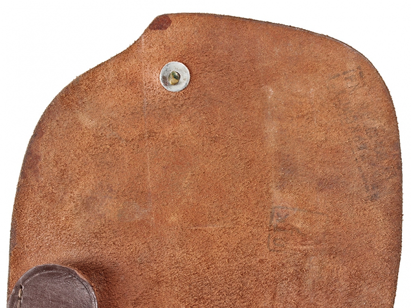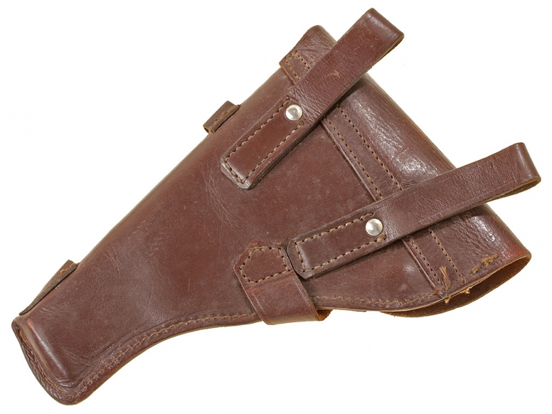 Кожаная кобура к пистолету системы Токарева образца 1933 года (ТТ). Послевоенного выпуска, под крышкой на внутренней стороне имеются клейма фабрики кожаных изделий. Кожа в хорошем состоянии, незначительные следы ношения.
