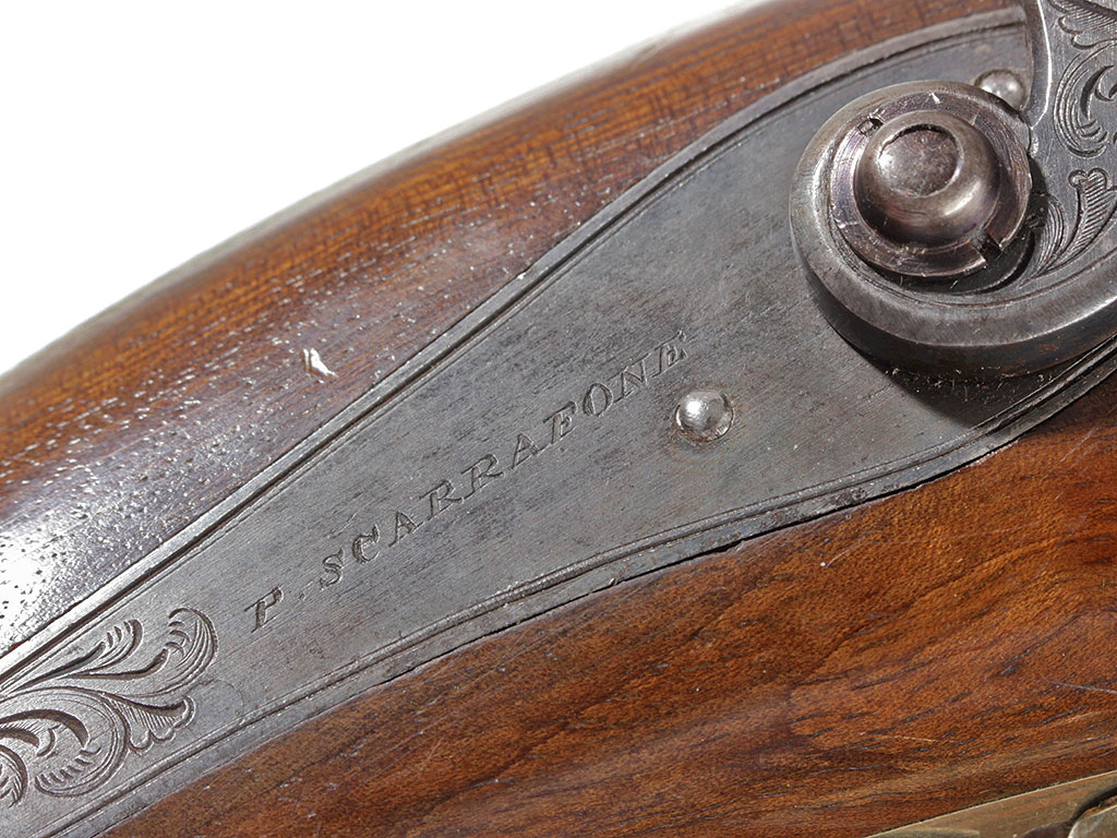 Дорожный пистолет произвольного образца, изготовленный в середине XIХ века в Италии. Ствол пистолета граненый, полированный, вороненый. У основания на верхней грани ствола - позолоченное клеймо мастера "SCARRAFONE". Замок кансюльный, курок и замочная доска украшены гравированным орнаментом На замочной доске выгравирована фамилия мастера: "P. SCARRAFONE". Скоба, а также устье шомпольного входа выполнены из латуни и украшены тонким гравированным орнаментом. Шомпол стальной с позолоченной шляпкой. Рукоять и ложа из орехового дерева, пятка рукояти закрыта латунным основанием с крышкой, имеет пенал для капсюлей. Отличное состояние, замок исправен.