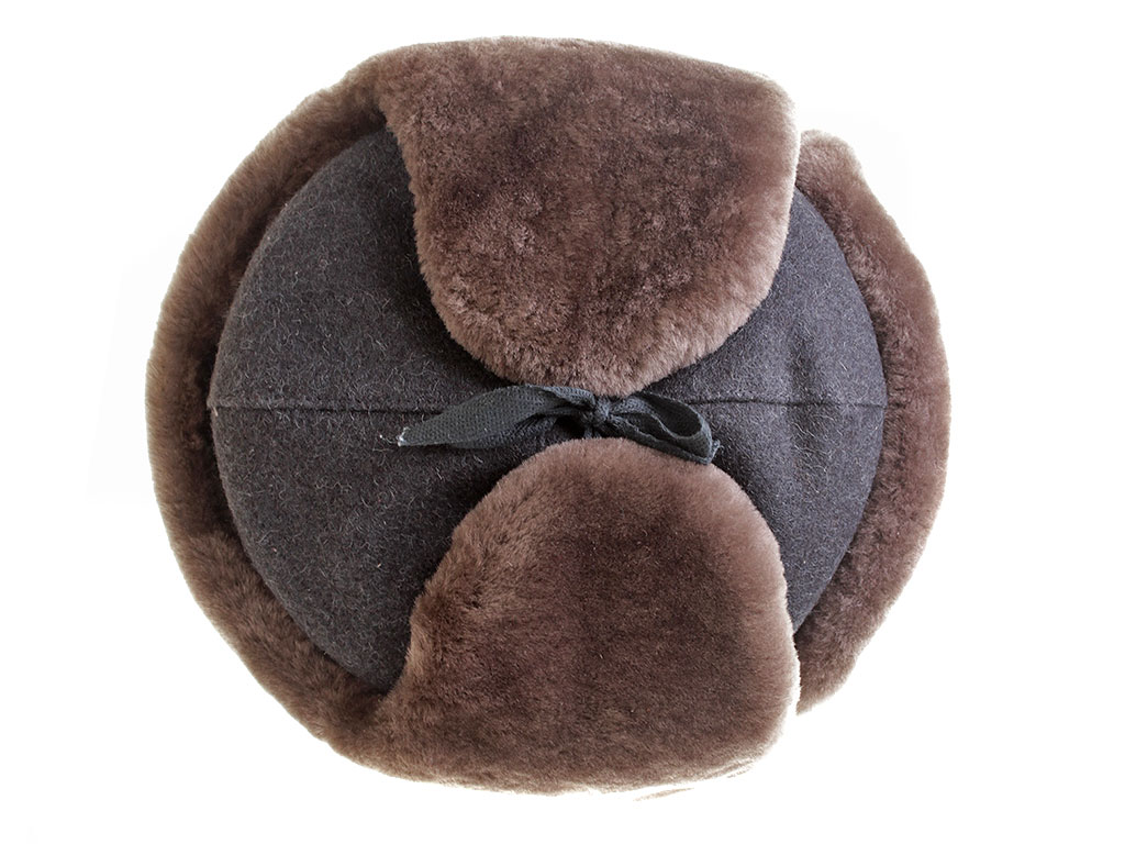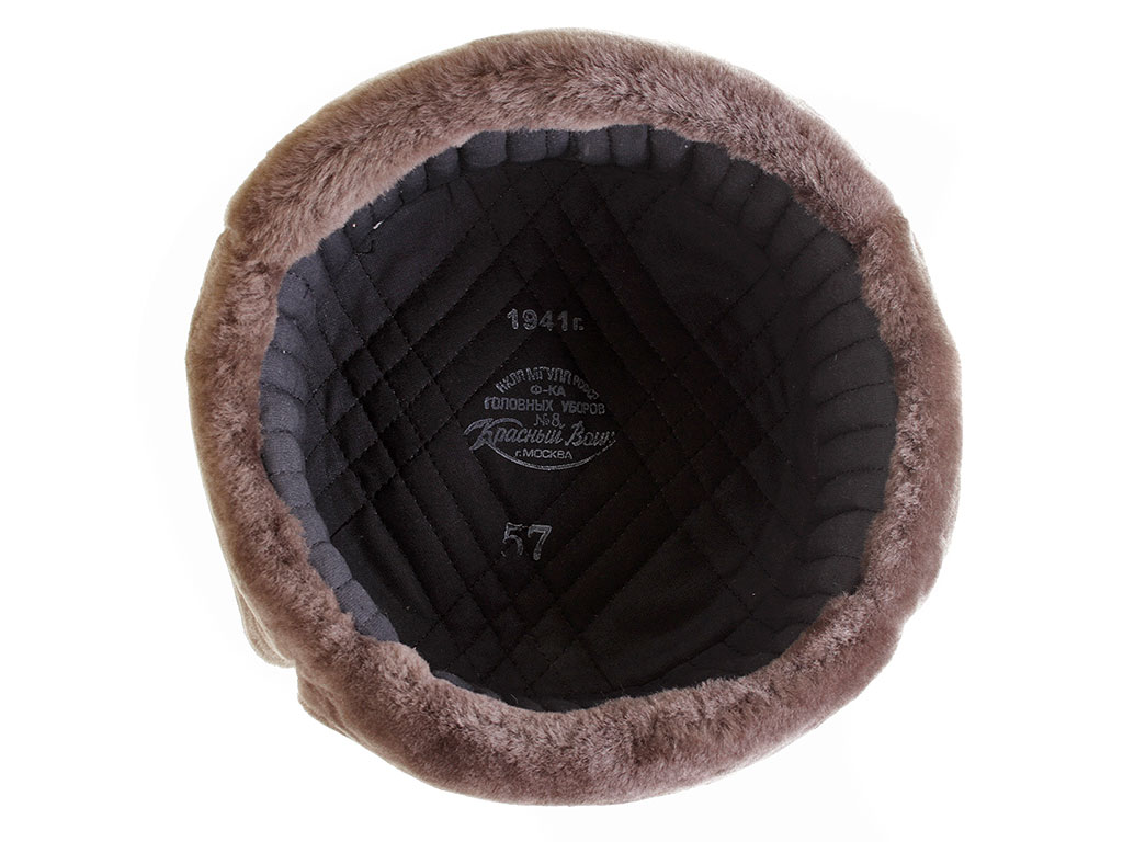 Шапка - ушанка из натурального цигейкового меха бурого цвета. Верх из шерстяной ткани серого цвета. Кокарда установленного образца.
