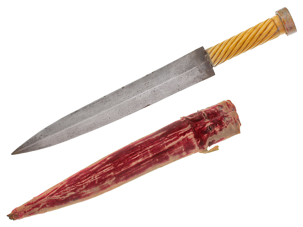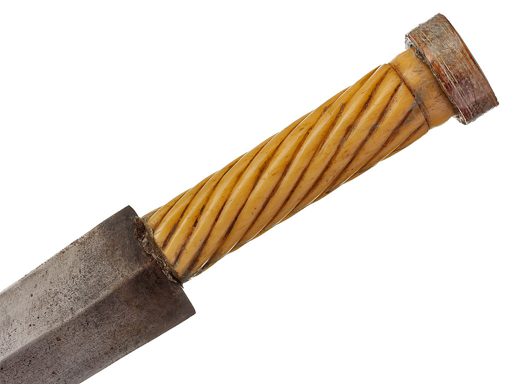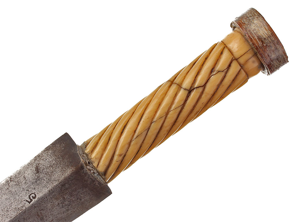 Рукоять из слоновой кости с дисковидным завершением. Покрыта наклонными точеными канавками с обеих сторон.