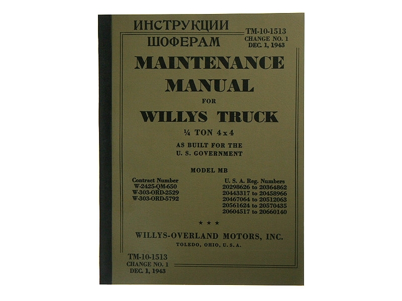 Инструкция шоферам по управлению и уходу за грузовым автомобилем Willys, модель "МВ" 1/4 тонн 4х4 (государственный грузовик). Качественный репринт оригинального издания. На английском и русском языках.