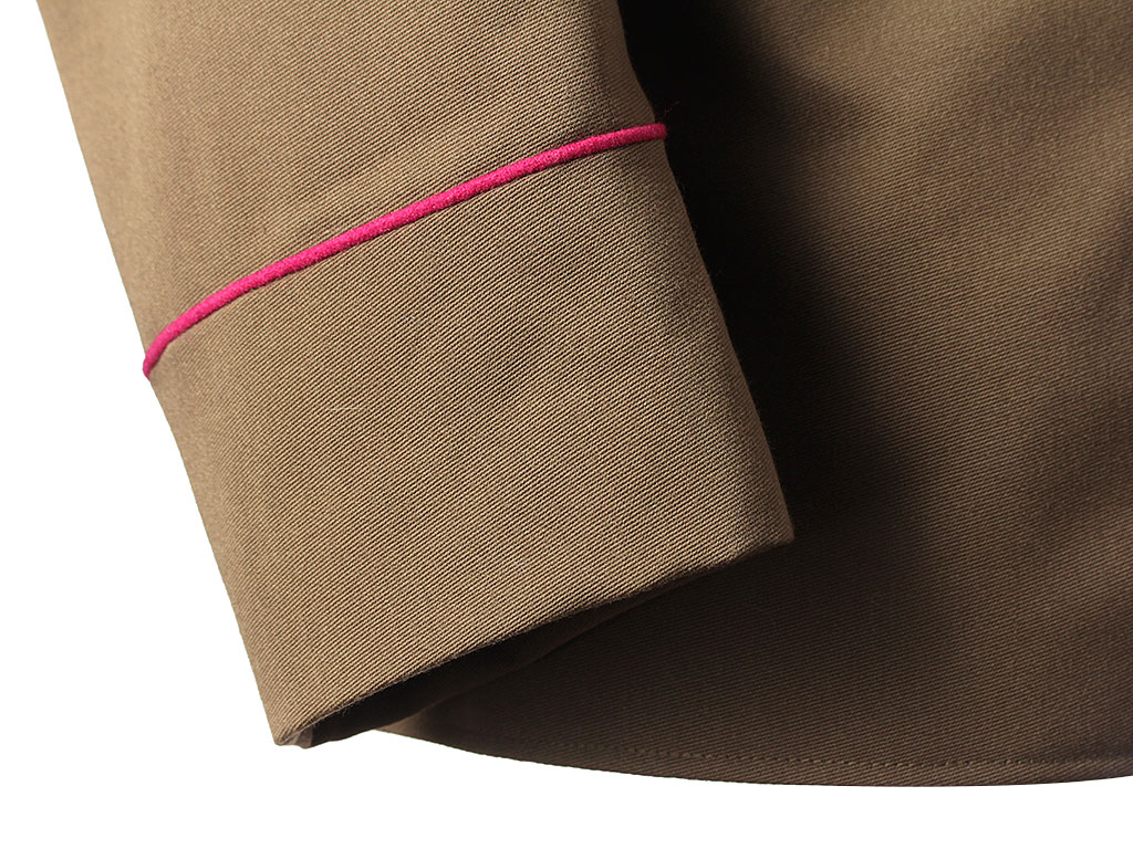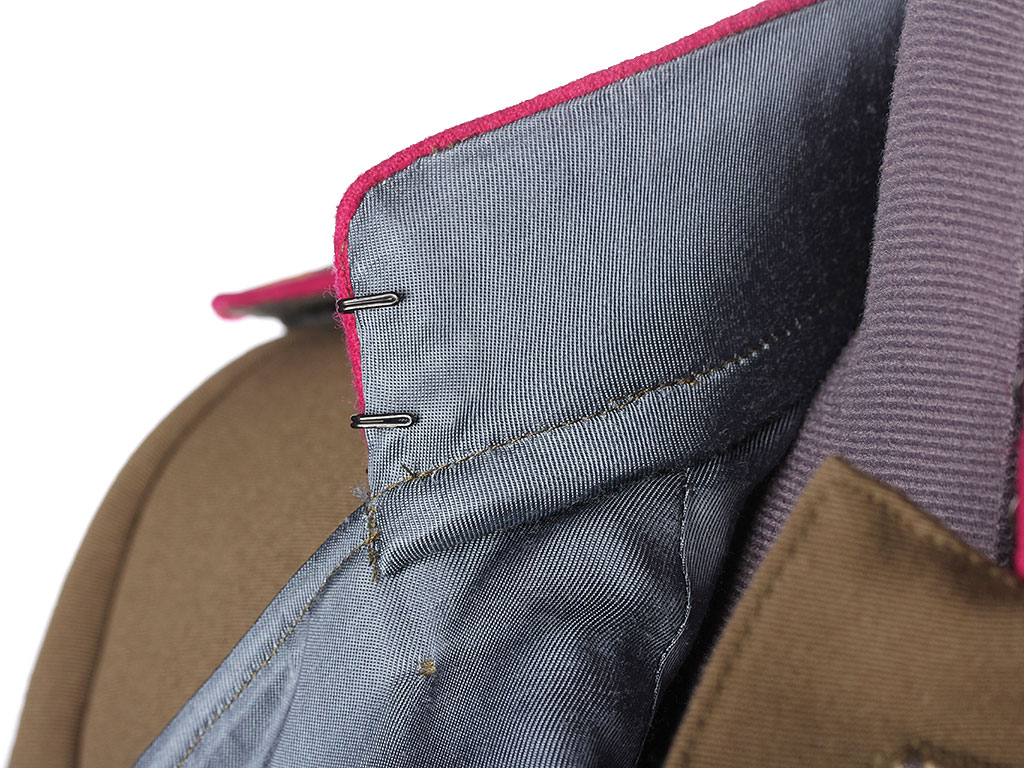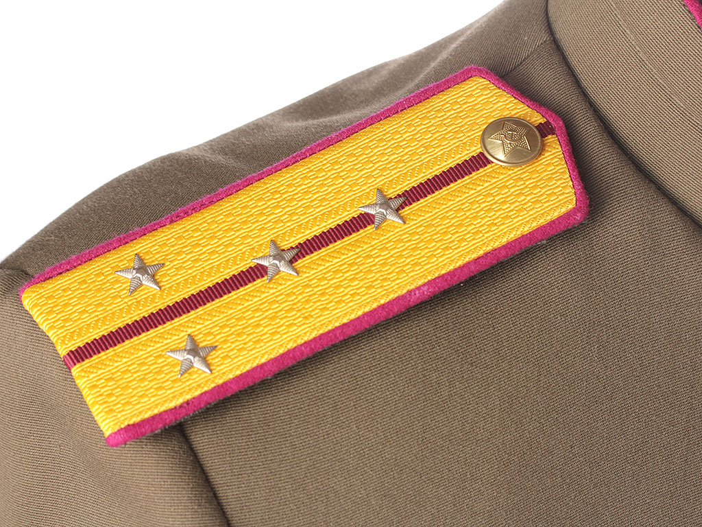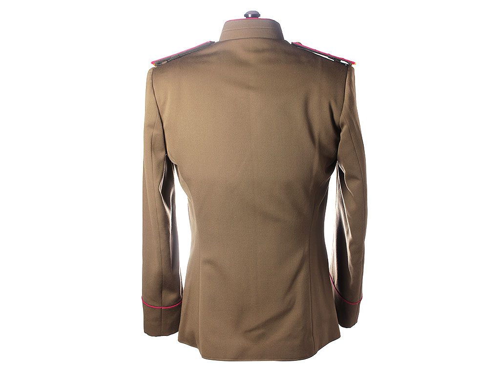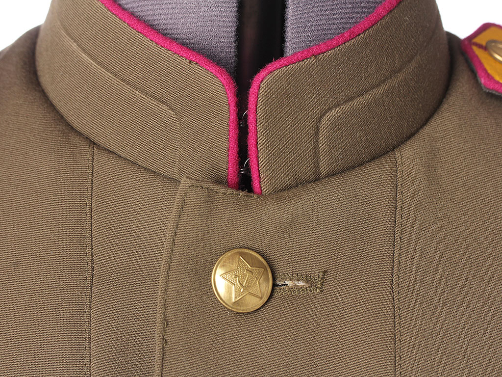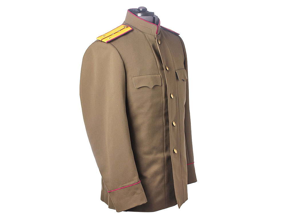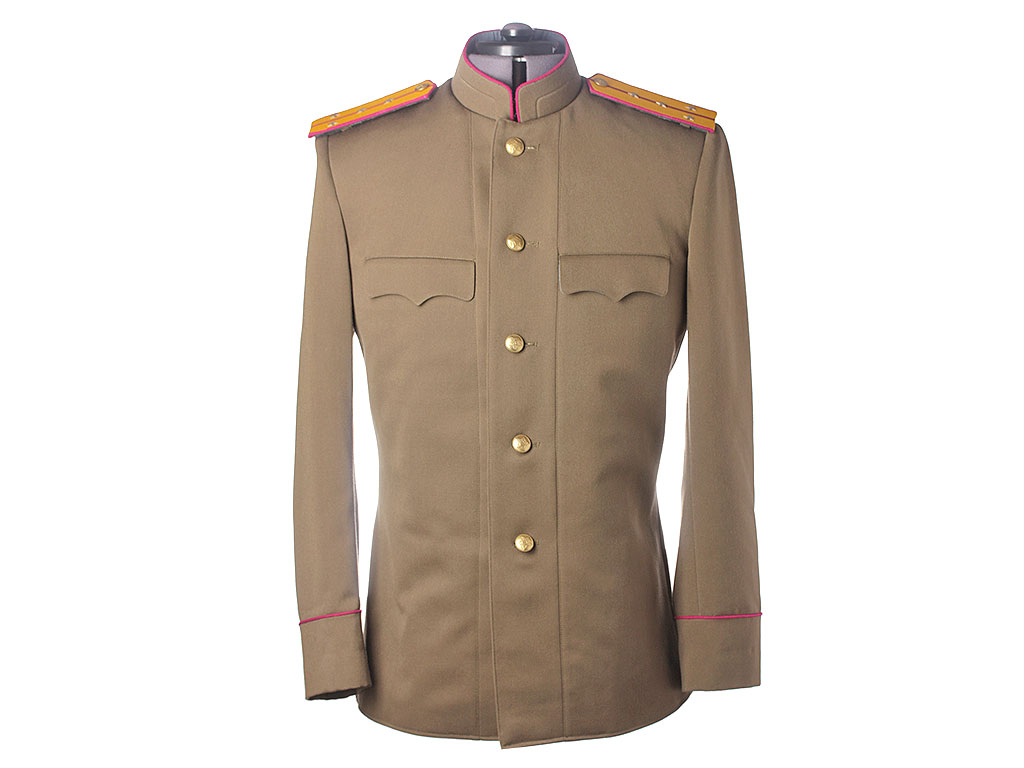 Китель офицерский повседневный образца 1943 года. Из качественной полушерстяной ткани, практически идентичной оригинальной. Воротник-стоечка имеет малиновую выпушку и застегивается на два крючка. Китель однобортный, с одним рядом металлических пуговиц. Имеет два нагрудных потайных кармана с клапанами. Рукава также имеют малиновую выпушку (пехотные части РККА). Китель укомплектован повседневными погонами со знаками различия капитана.