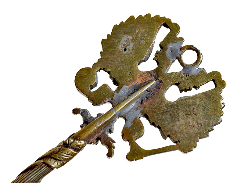 Камергерский ключ периода правления Николая II. Бронза, частично сохранилось золочение. Орел ремонтировался, отсутствует заколка; вместо нее припаяно ушко. Отсутствует также Императорская корона.