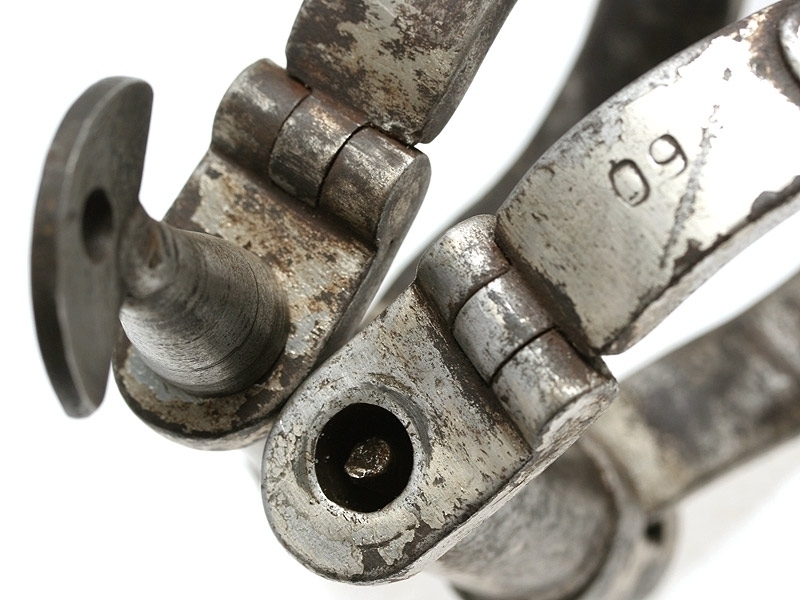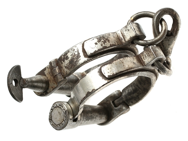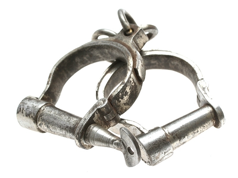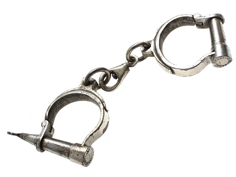 Наручные кандалы с винтовым фиксатором - не полицейский вариант, а для тюремного содержания. На боковой поверхности имеется клеймо "60". Хорошее состояние, механизм в рабочем состоянии, ключ в наличии.
