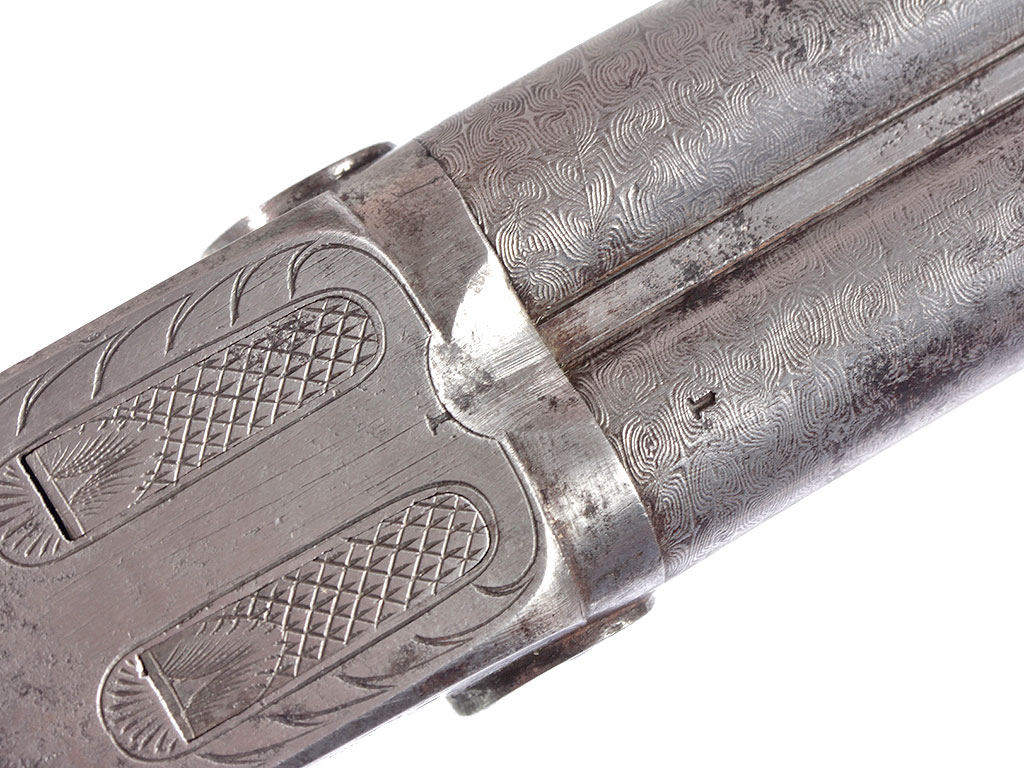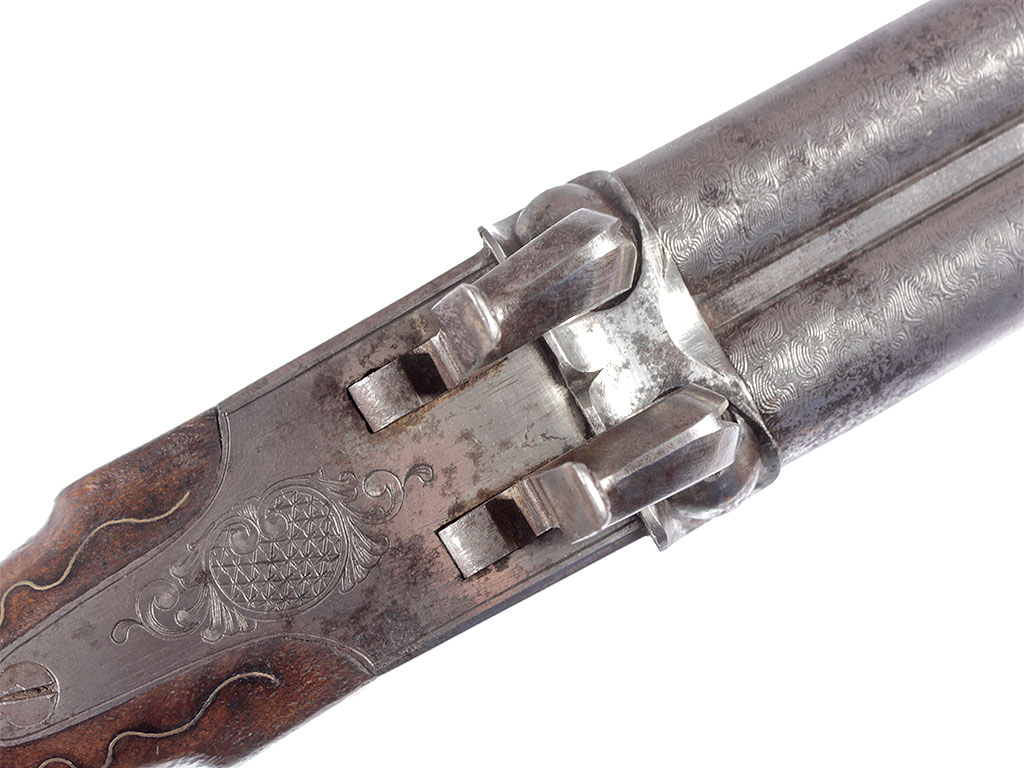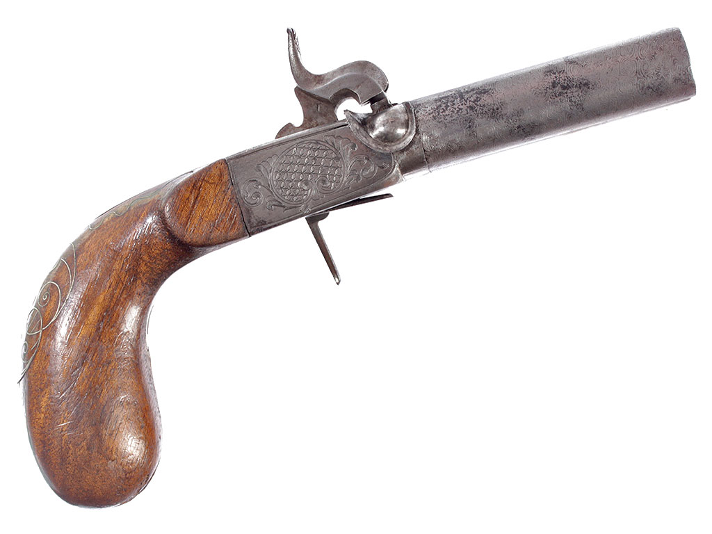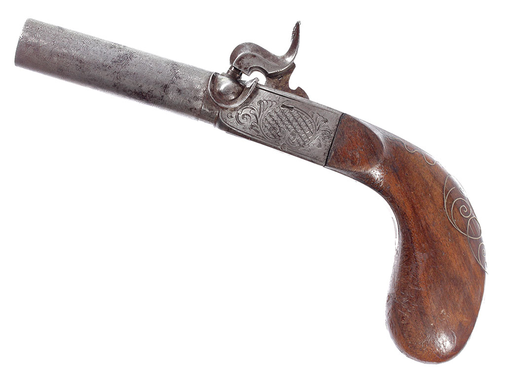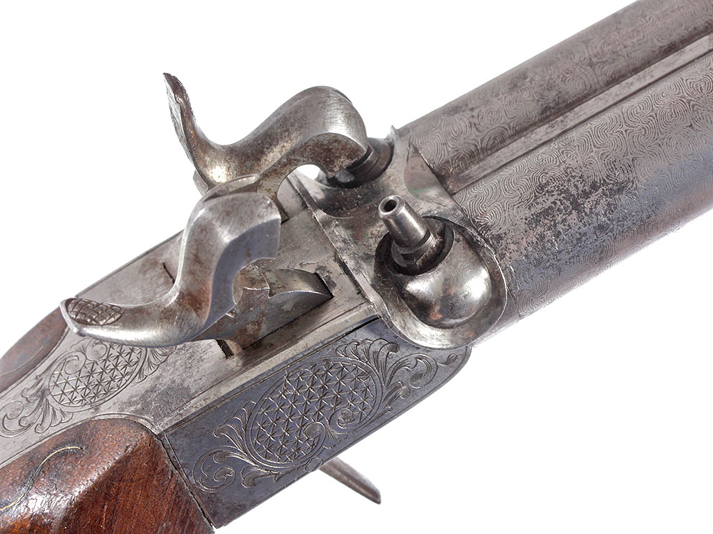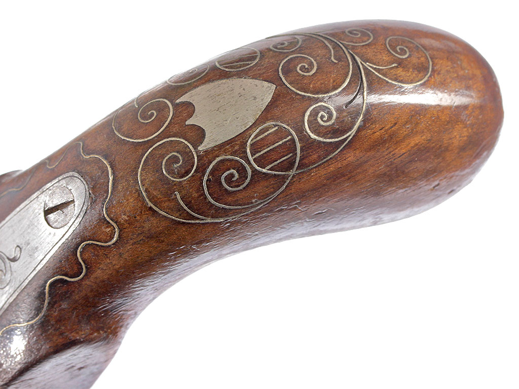 Пистолет с расположенными горизонтально двумя стволами - произвольная дорожная (жилетная) модель второй трети XIX века. Стволы украшены травленым орнаментом, имитирующим рисунок дамасской стали. Без клейм. Все металлические части, кроме стволов, украшены гравированным орнаментом. Курки полностью исправны, спусковые крючки сделаны складывающимися (они раскладываются при взведении курков). Рукоять из орехового дерева, инкрустирована серебряной проволокой. В тыльной части рукояти врезан серебряный щиток, на который по желанию владельца можно было нанести его монограмму.