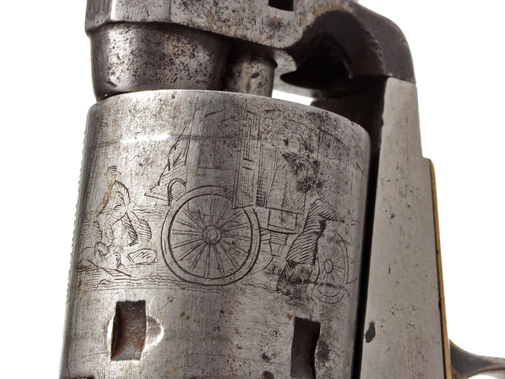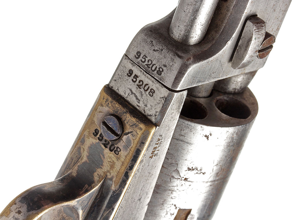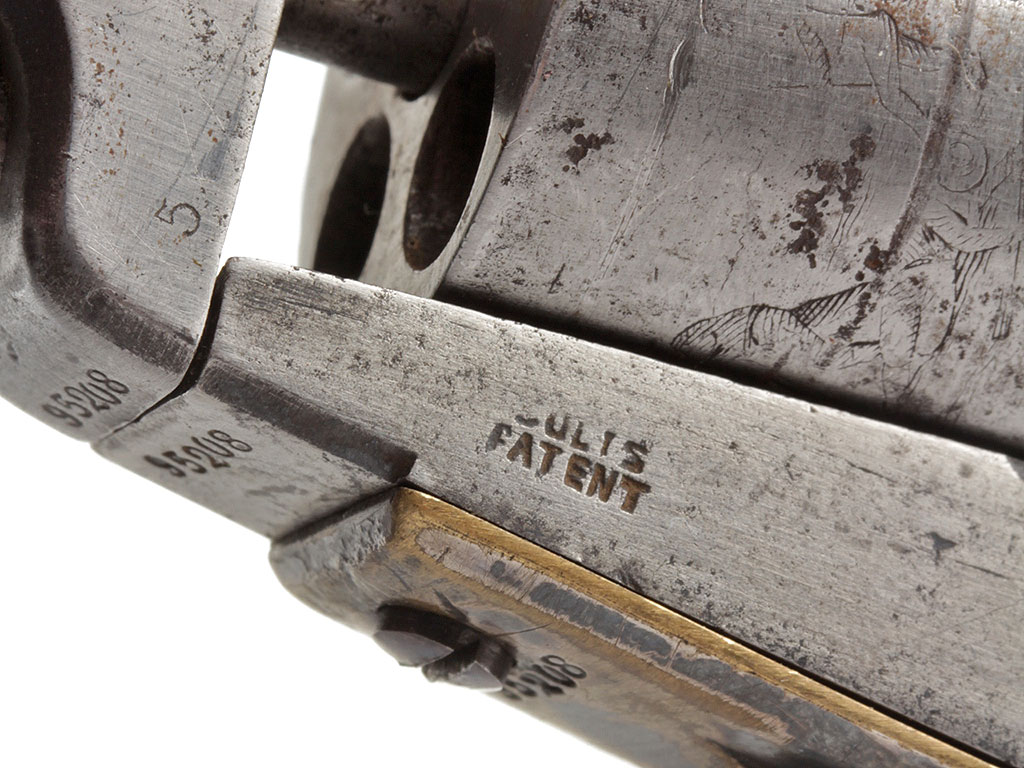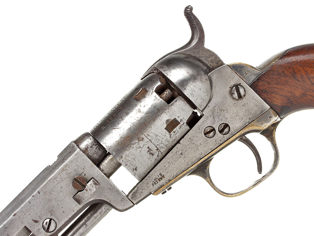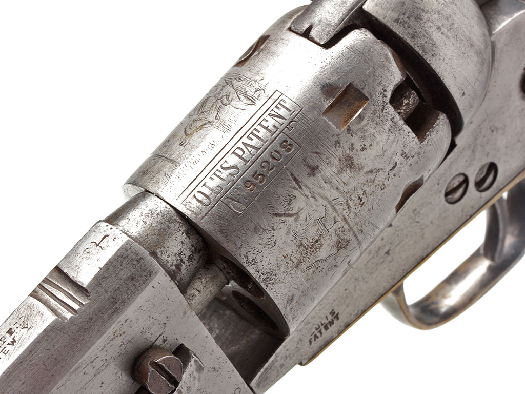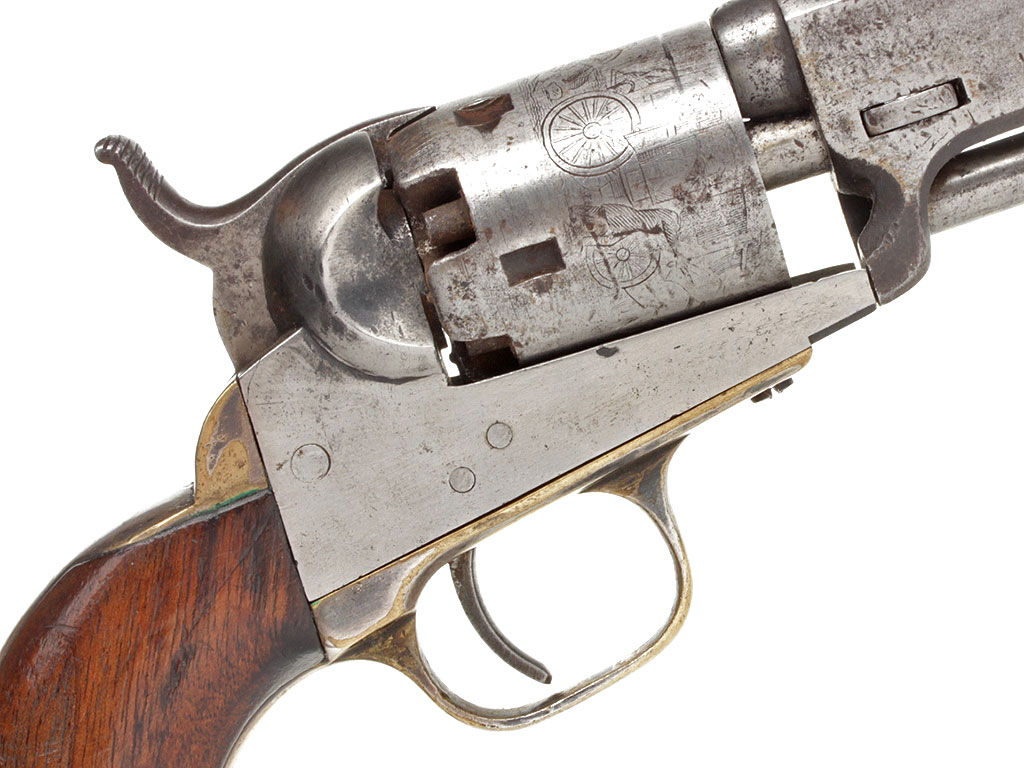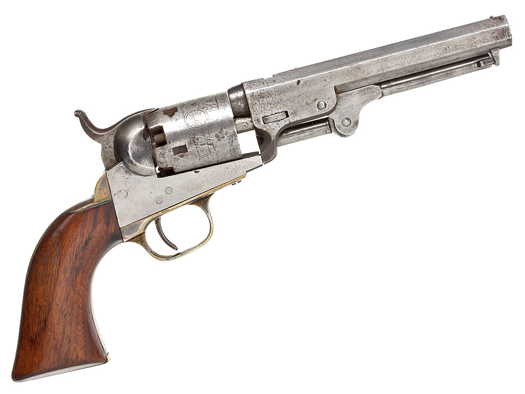 Капсюльный шестизарядный револьвер системы Кольта, модель 1849 года. 31-й калибр. Корпус в средней степени сохранности, имеются поверхностные следы коррозии. Тем не менее, револьвер полностью исправен. Судя по серийному номеру, изготовлен в 1854 году.