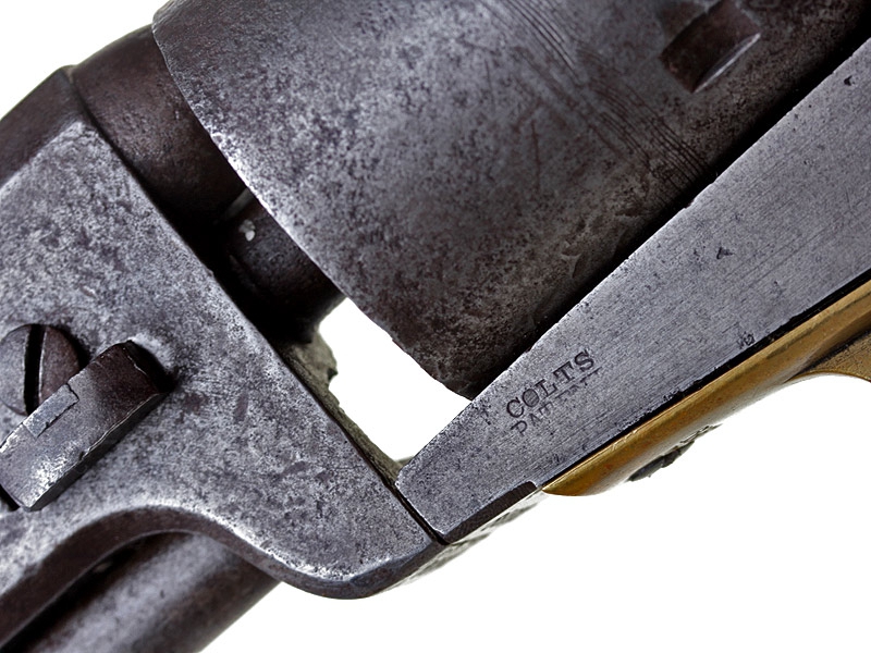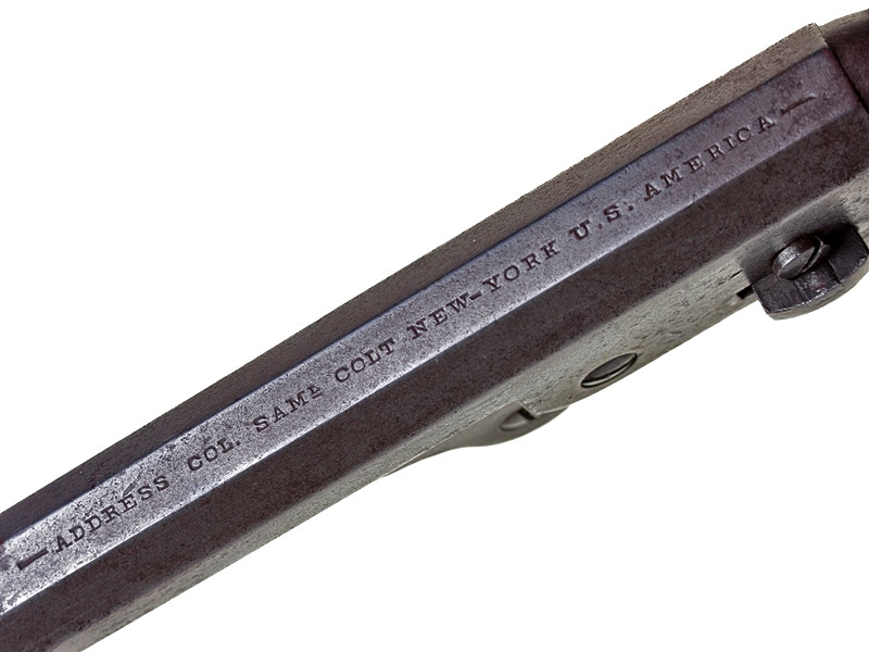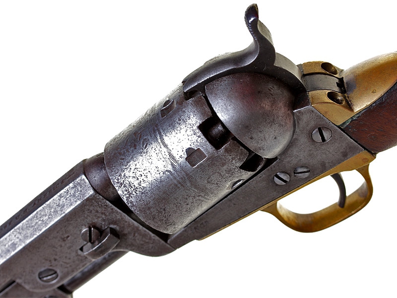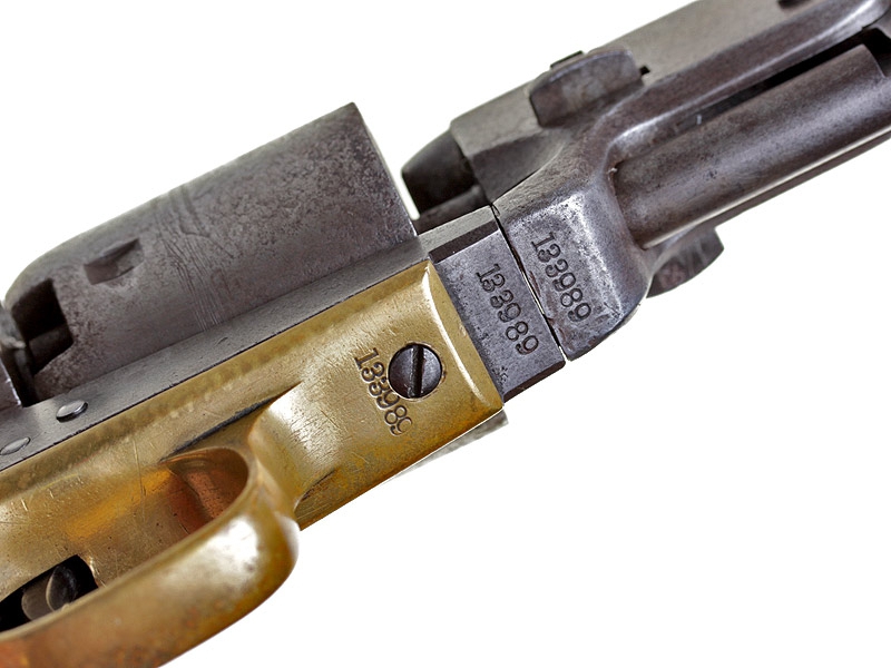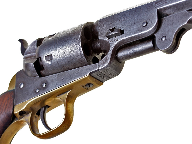 Капсюльный армейский револьвер системы Кольта образца 1851 года. На рамке револьвера четко читаемое клеймо "Colts Patent", на стволе - стандартная для таких револьверов надпись ""Address Col. Sam-l Colt New-York U.S.America". Оригинальные деревянные щечки рукояти, револьвер в очень хорошей сохранности. Все части на одном номере - "133989". На декабрь 1865 года, когда было объявлено об окончании Гражданской войны в США, серийные номера выпущенных Кольтов 1851 Нэви дошли примерно до № 185000.