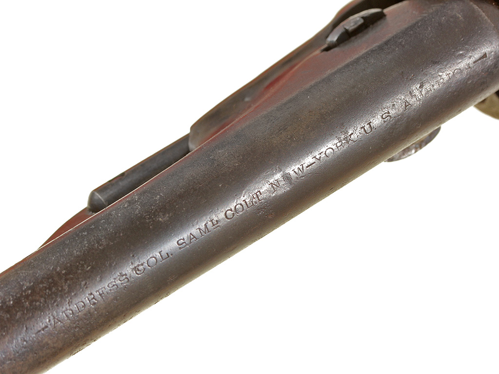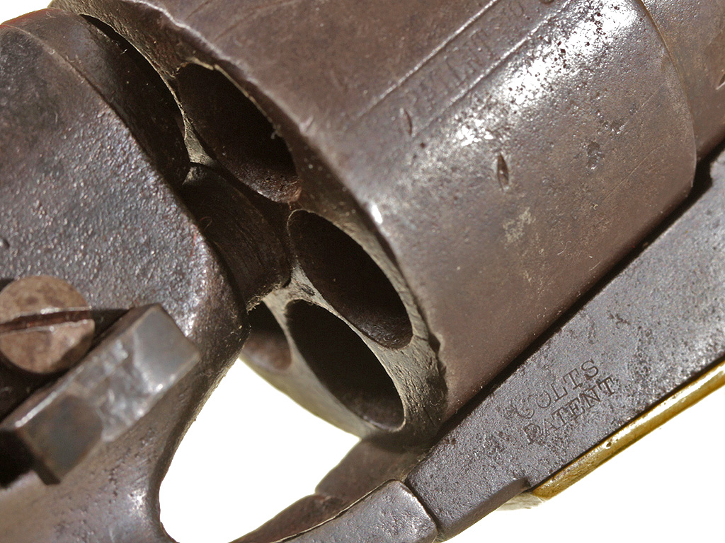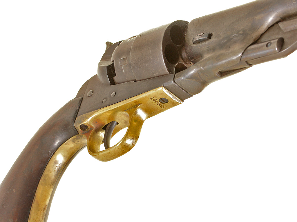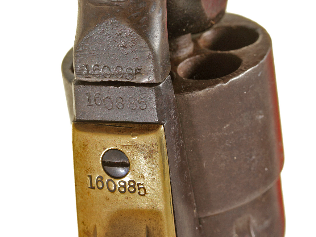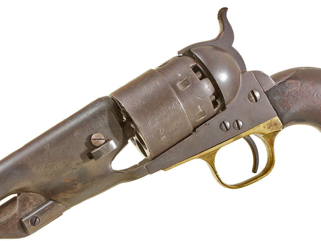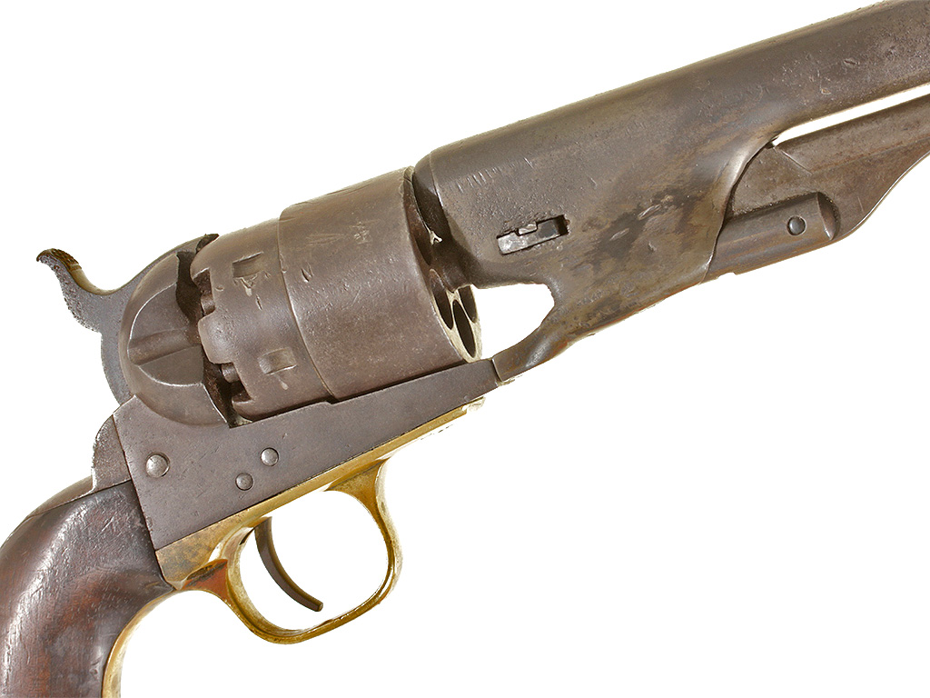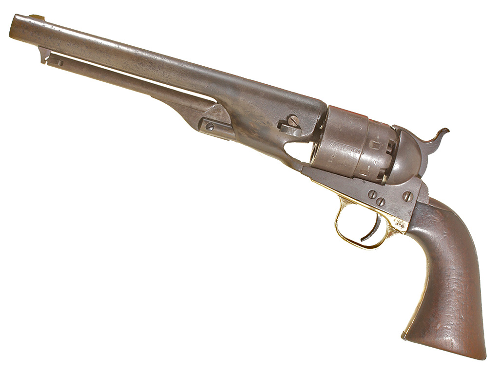 Капсюльный армейский револьвер системы Кольта образца 1860 года 44-го калибра. Оригинальные деревянные щечки рукояти, все части на одном номере - "160885". Судя по номеру, данный револьвер произведен в 1866 году. Механизм полностью исправен.