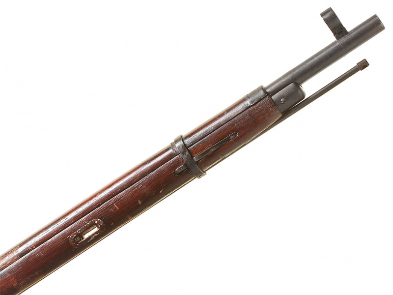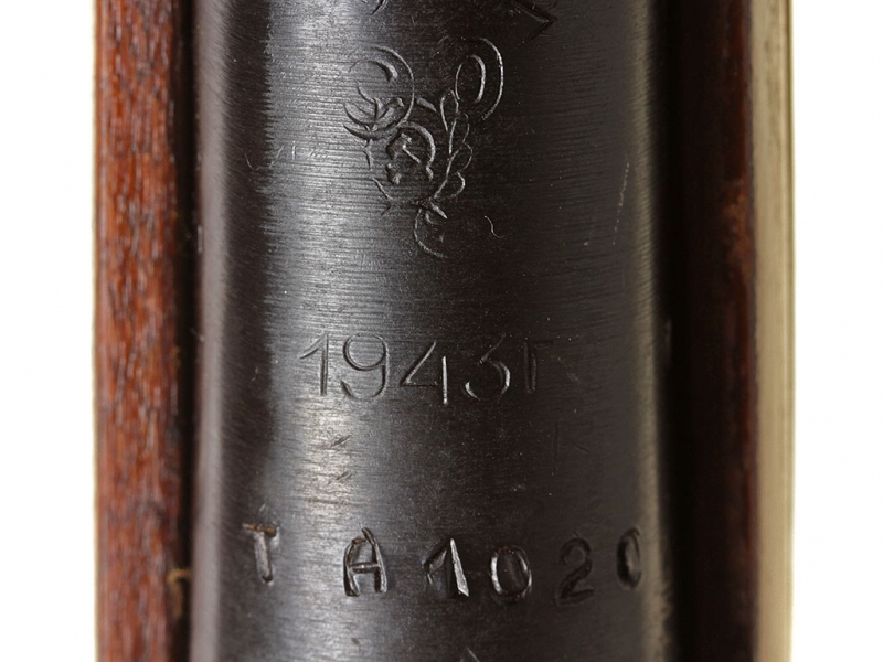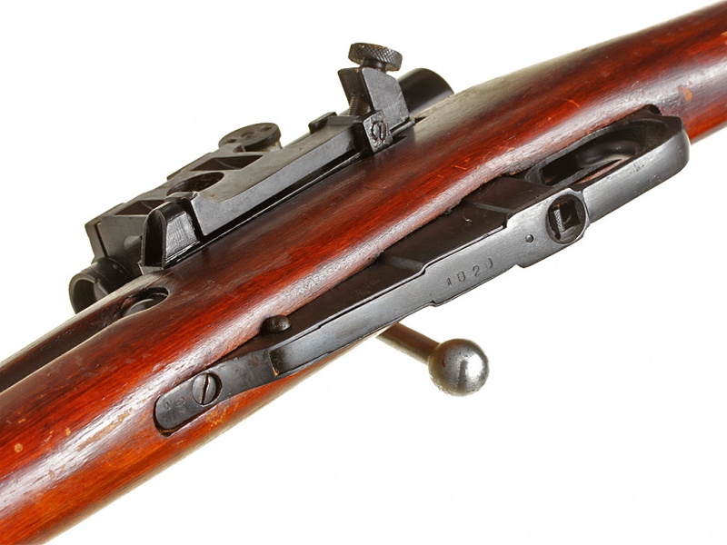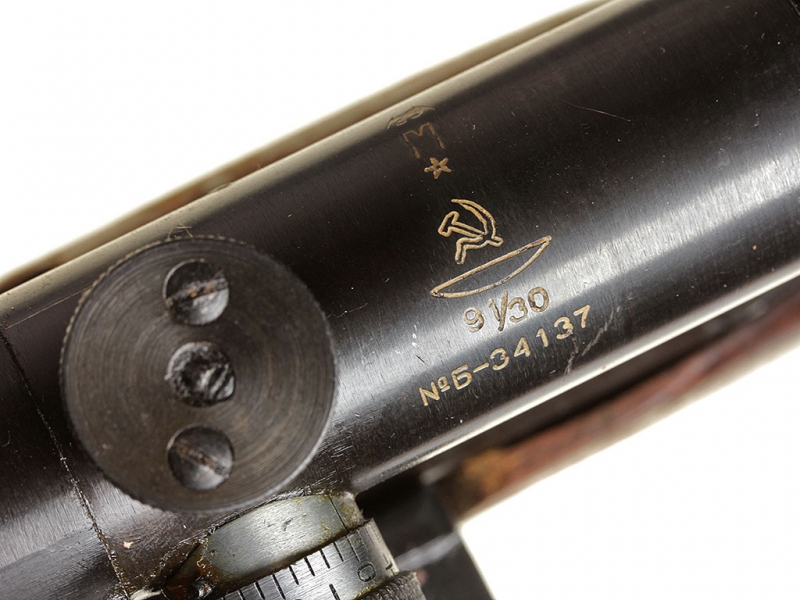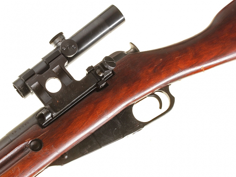 Снайперская модификация карабина системы Мосина образца 1938 года, изготовленная на Ижевском оружейном заводе в 1943 году. С приливом под прицел и загнутой рукояткой затвора, хзарактерной только для снайперского варианта. Оригинальное воронение, дерево в очень хорошем состоянии. Оптический прицел ПУ также в превосходном состоянии, полностью исправная оптика.