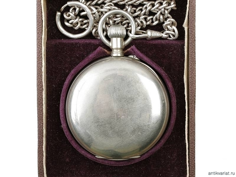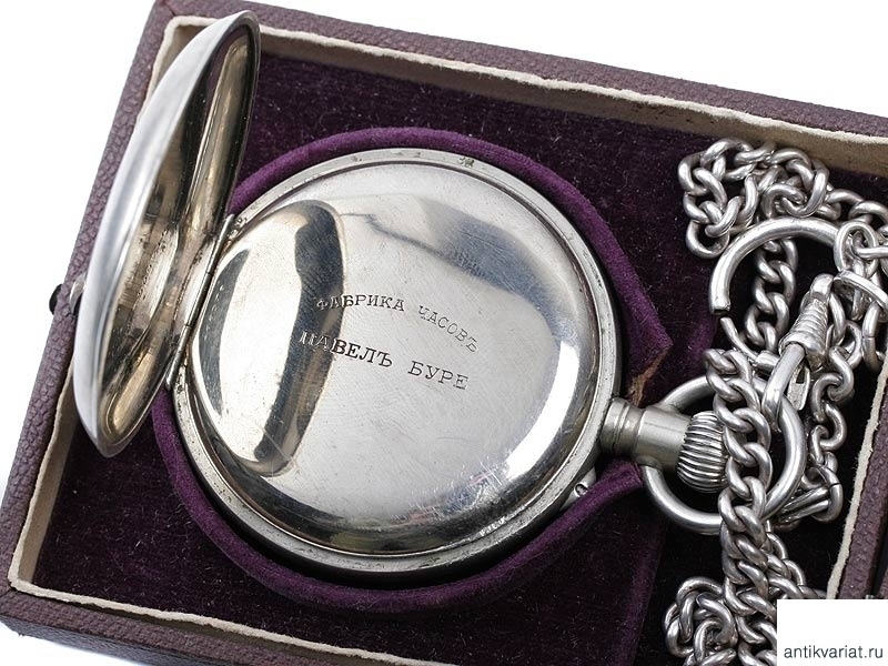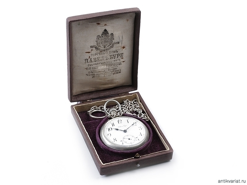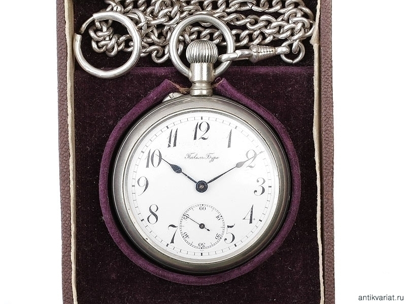 Карманные двухкрышечные часы фирмы "Павелъ Буре" в мельхиоровом корпусе с цепочкой, помещенные в оригинальный футляр. Выпуск начала ХХ века. Отличное состояние, на ходу.