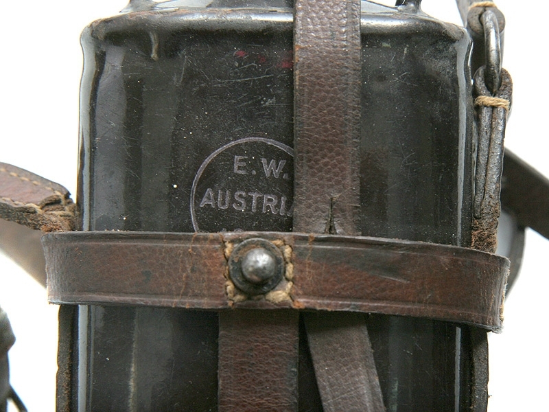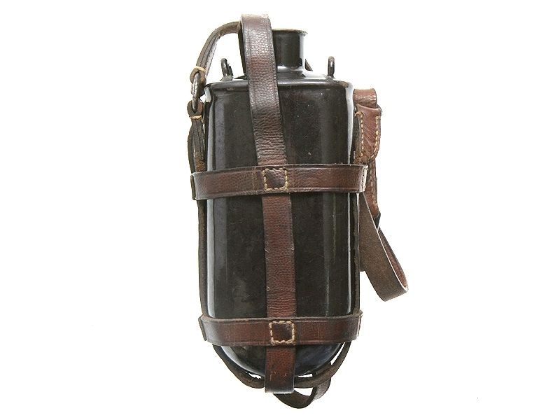 Кавалерийская фляга KuK периода Первой мировой войны в отличном состоянии, в комплекте с кожаным плечевым обвесом. Корпус эмалированный, с клеймом "E.W.Austria" и годом выпуска - 1915.