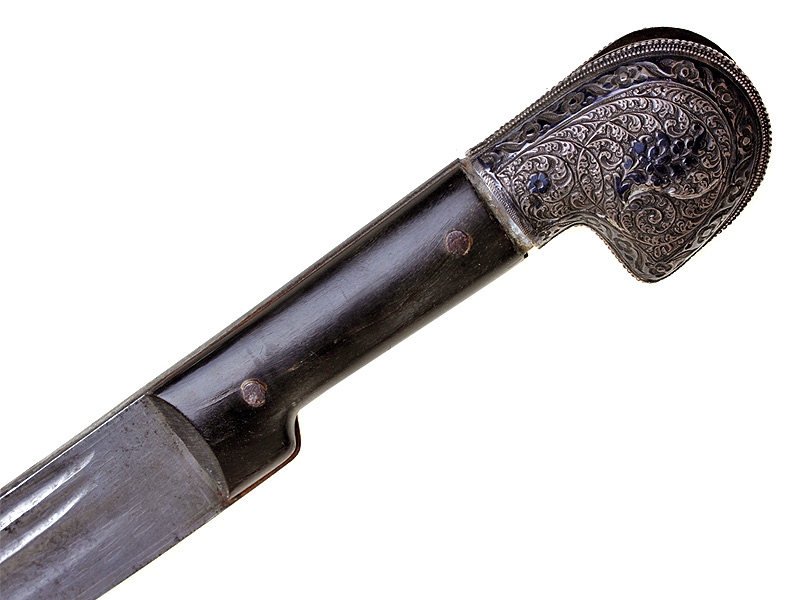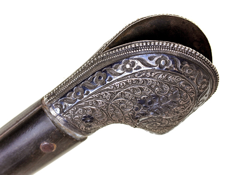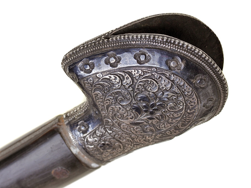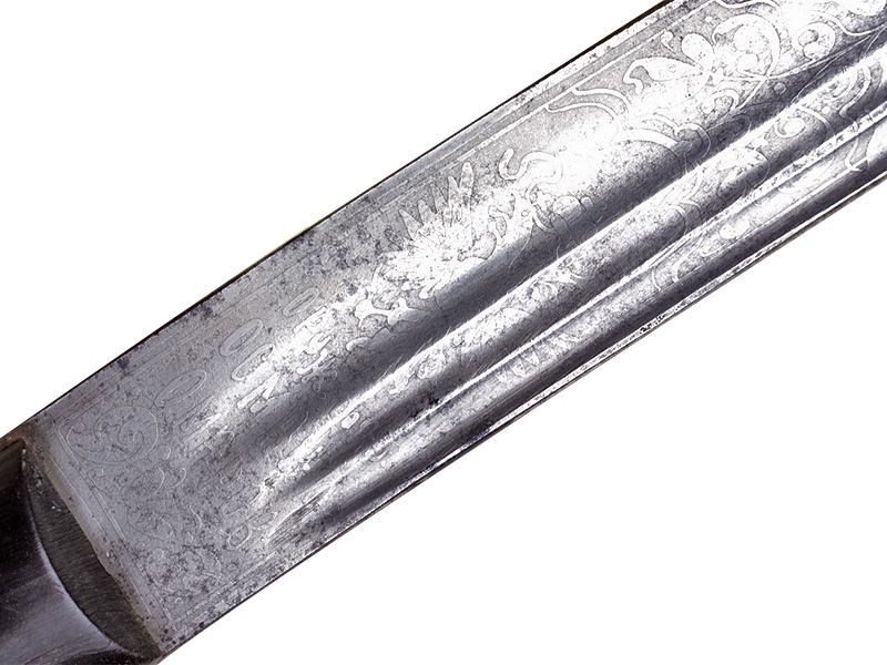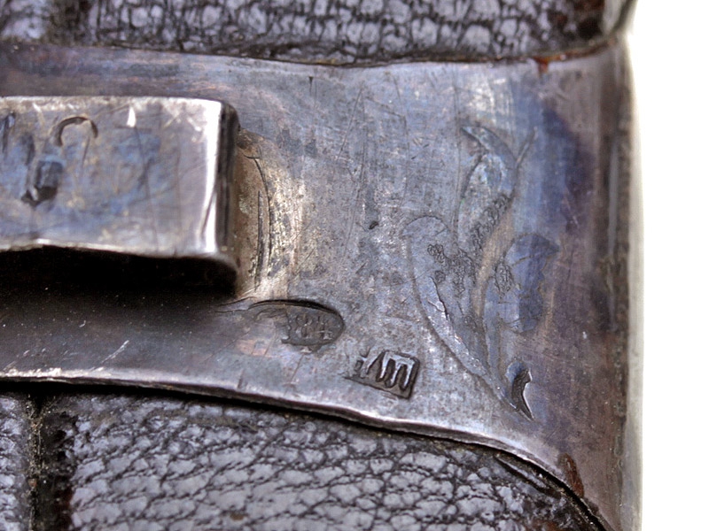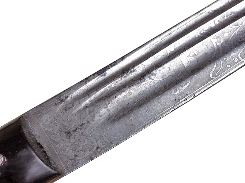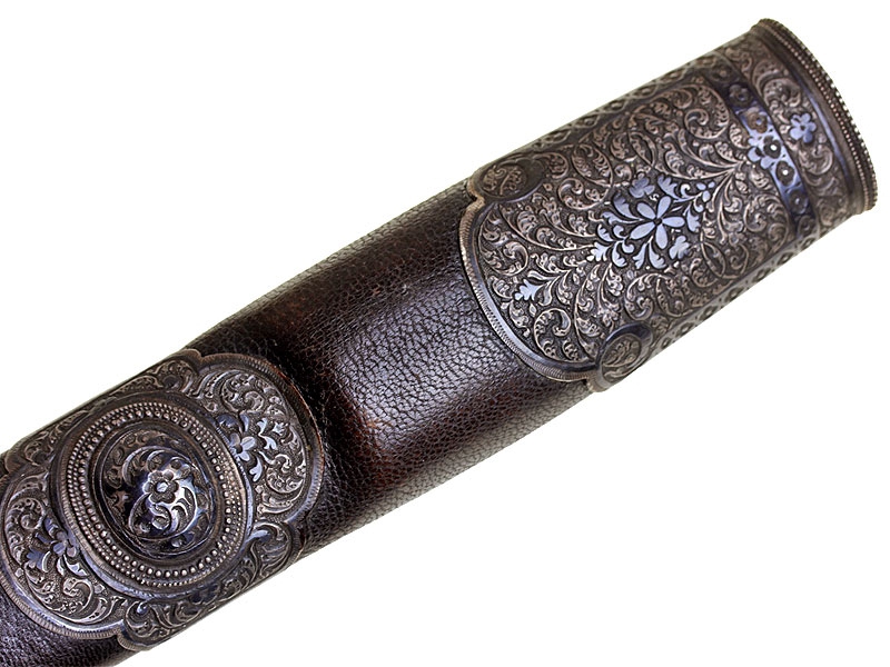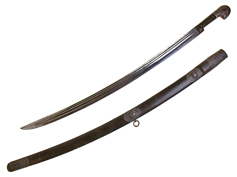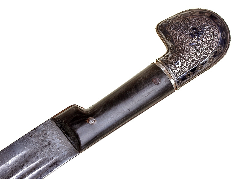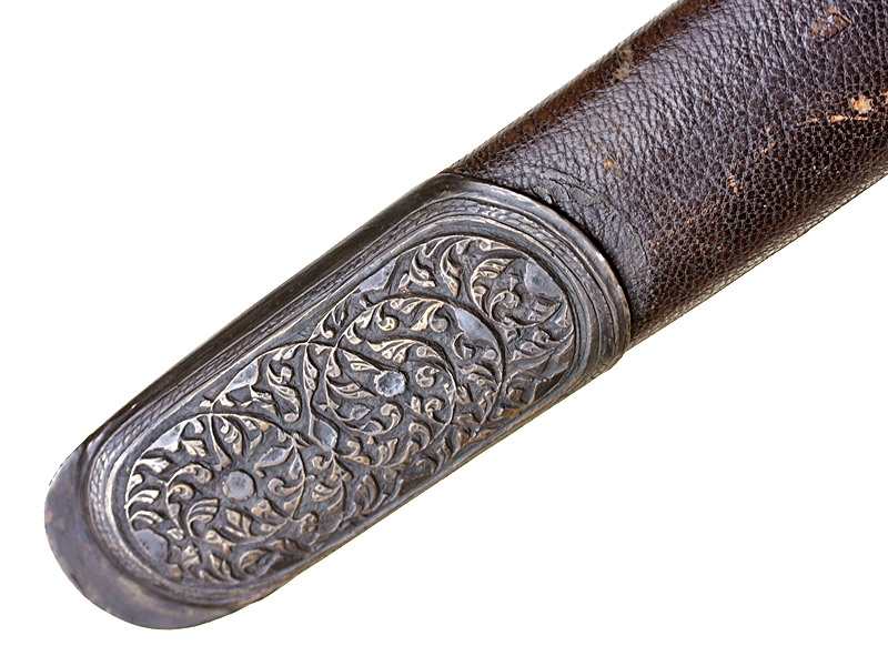 Кавказская шашка с серебряным прибором, украшенным гравировкой и чернью. Клинок незначительной кривизны, с двумя узкими и одним широким долом. У основания клинка с лицевой стороны - травленое в низком рельефе изображение вензеля Императора Николая II, с оборотной - травленое изображение двуглавого орла с подписью под ним в три строки "ОРУЖ. ФАБ. ОСМАНА ОМАРОВ." (такая подпись ставилась на изделиях его владикавказской мастерской). Рукоять шашки азиатского типа, образована двумя накладками черного рога и имеет навершие, изготовленное из серебра и украшенное гравированным растительным орнаментом с черневыми элементами. Ножны деревянные, обтянуты черной кожей. Прибор ножен изготовлен из серебра, состоит из устья, двух обоймиц и наконечника. Внешняя сторона прибора ножен украшена гравированным растительным орнаментом. Имеются пробирные клейма "84" и мастера "НТ".