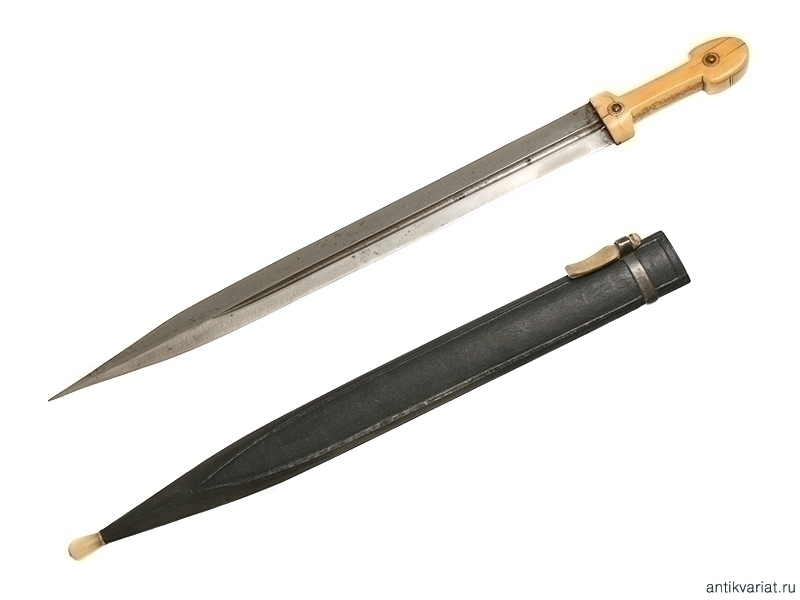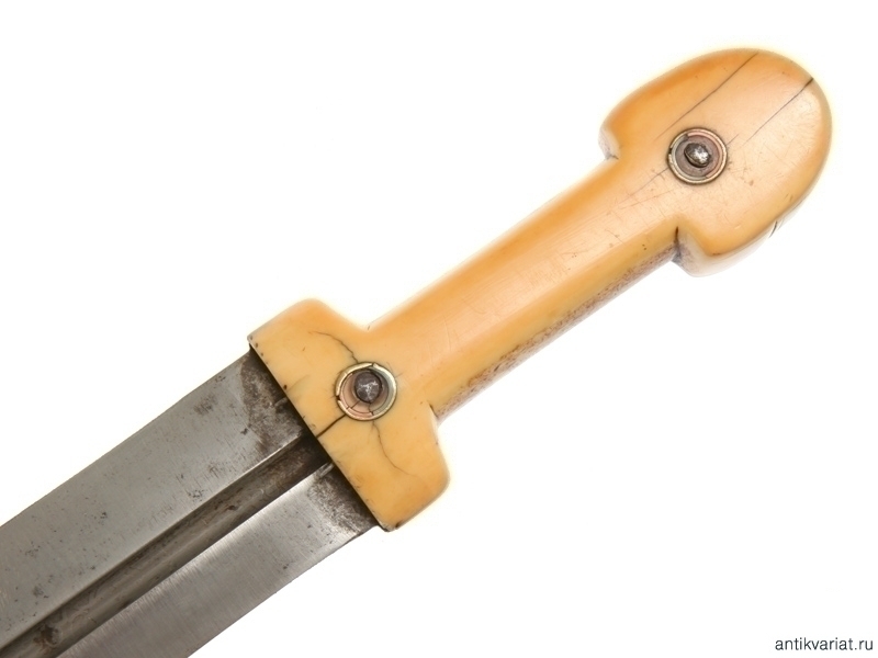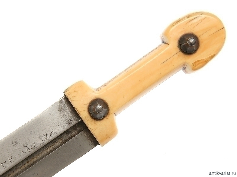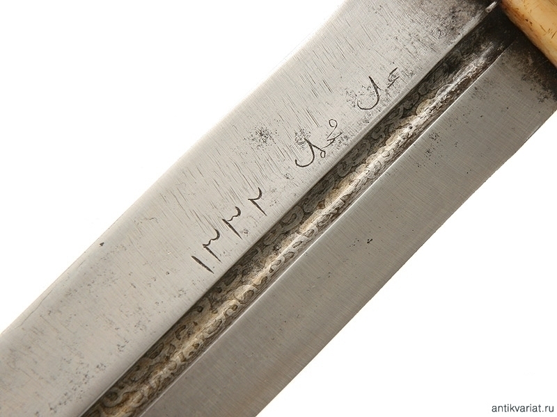 Кавказский кинжал общей длиной 71,5 см в очень хорошем нетронутом состоянии. Клинок с одним широким долом, красивый волнистый рисунок хорошо заметен. На клинке имеются также клейма мастера. Рукоять из слоновой кости, заклепки серебряные, украшенные чернью.