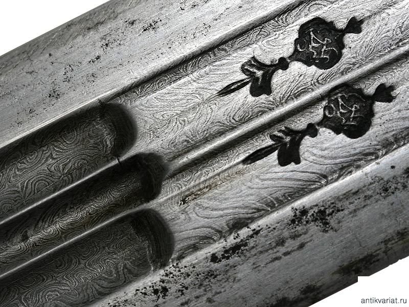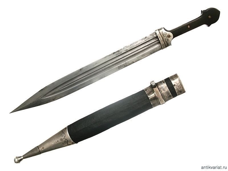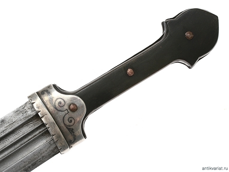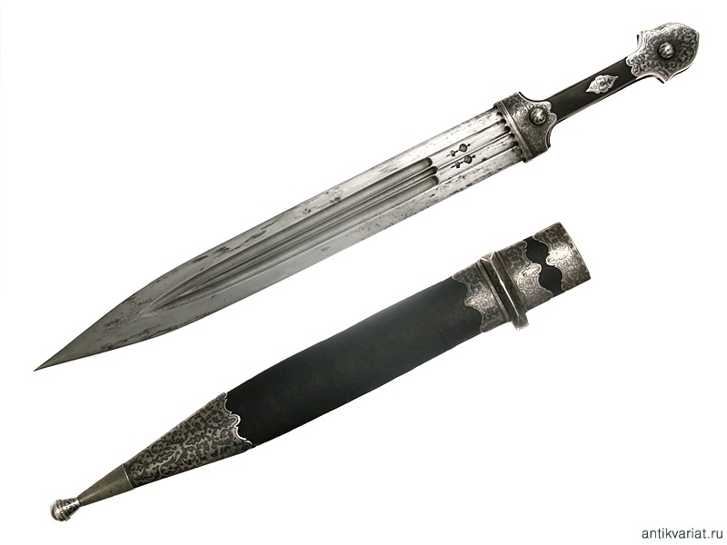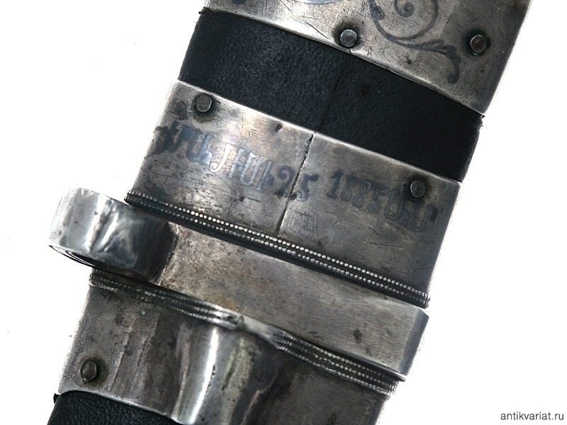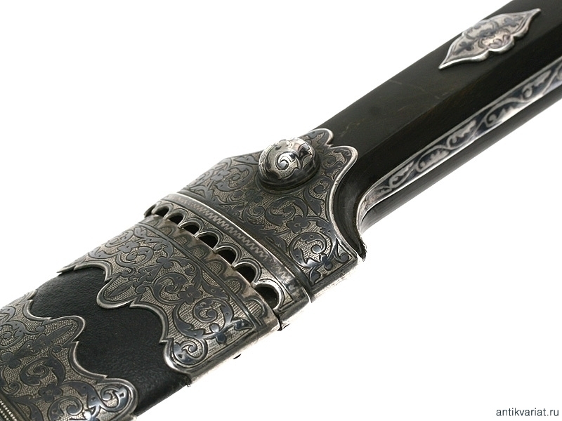 Кинжал работы армянских мастеров, датированный 1885 годом. Заклепки на рукояти, устье и наконечник ножен изготовлены из серебра и украшены черневым растительным орнаментом. На кольце ножен с оборотной стороны нанесена надпись с датой изготовления кинжала. Клинок с тремя узкими долами, в которых четко просматривается дамасский узор стали. У основания клинка - два сложных клейма с арабографичными надписями: при изготовлении кинжала использован клинок, возможно, чеченской работы. Кожа на ножнах отреставрирована, в остальном очень хорошее состояние.