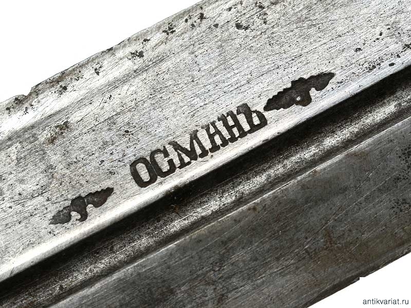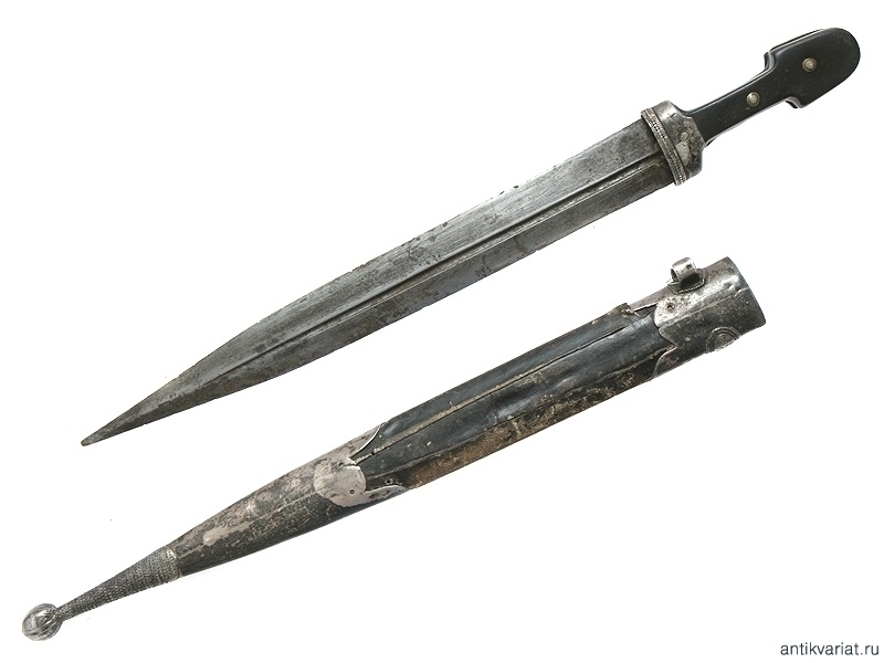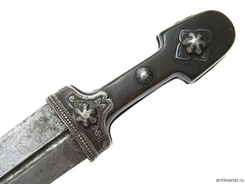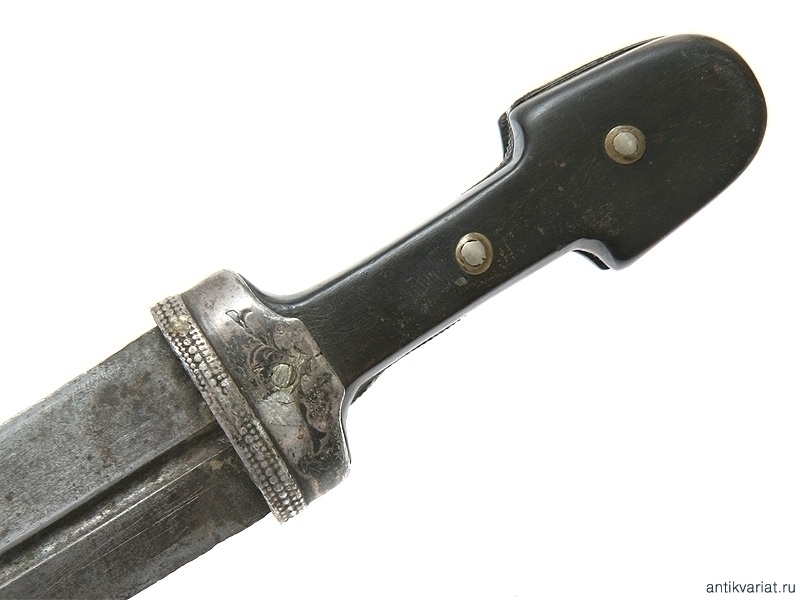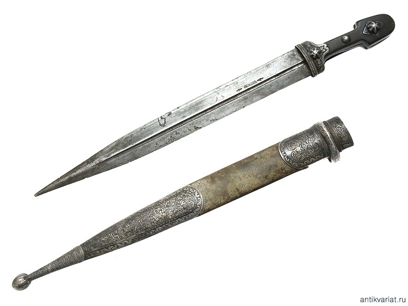 Кавказский кинжал начала ХХ века с хорошо сохранившимся клеймом "Османъ" на клинке. Рукоять роговая, украшена серебряными накладками с черневым орнаментом. Ножны деревянные, обтянутые зеленым бархатом. Прибор ножен серебряный, украшен чернью и позолотой. Хорошее состояние..